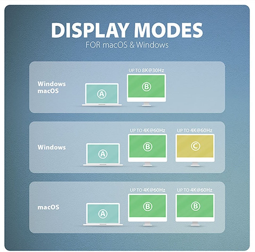 • Ak chcete dosiahnuť maximálne hodnoty rozlíšenia a frekvencie na video výstupoch, dokovacia stanica musí byť pripojená k portu USB-C s podporou DisplayPort Alternate Mode (DP Alt Mode) vo verzii min. 1.4 alebo do USB-C portu s podporou min. Thunderbolt 3. Ďalej je nutný aj vhodný aktualizovaný operačný systém a aktuálne grafické ovládače.