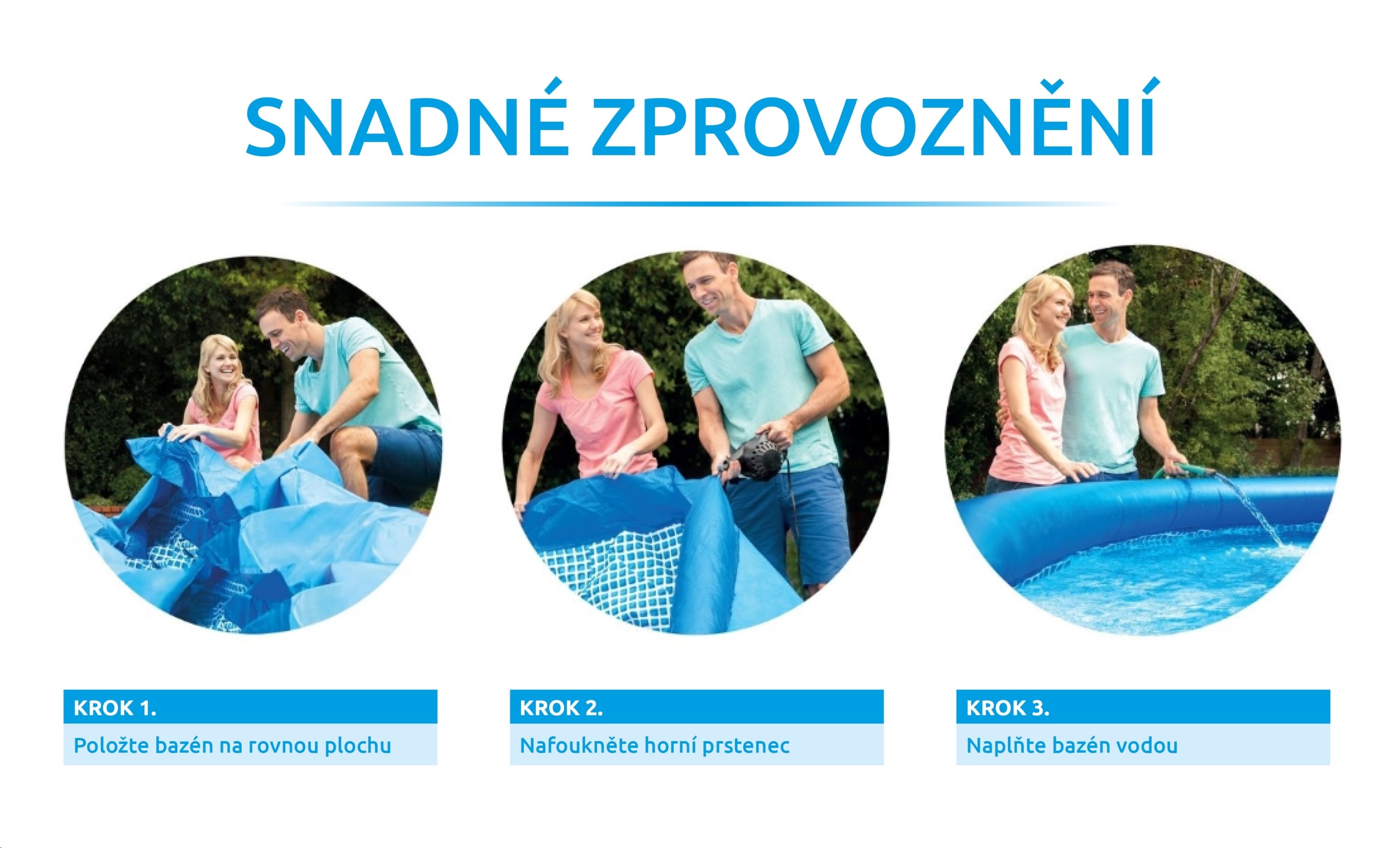 Pripravte si pre kruhový bazén Tampa rovný podklad a položte naň bazénovú podložku. Na ňu rozbaľte bazén, nafúknite kruhový golier a máte takmer hotovo. Akonáhle začnete do bazéna napúšťať vodu, stačí len pozorovať, ako sa sám postaví. Po dosiahnutí požadovanej úrovne hladiny je bazén pripravený na kúpanie.