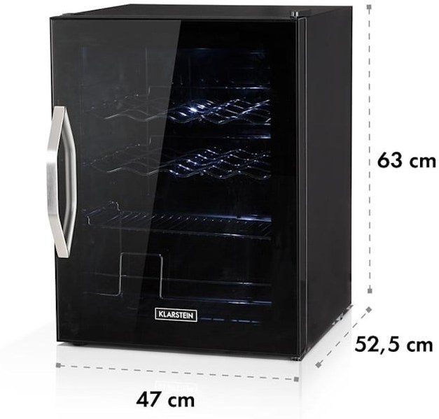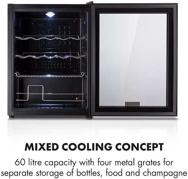 So svojimi kompaktnými rozmermi je chladnička na nápoje Klarstein Beersafe XL Onyx veľmi veľká z hľadiska úložného priestoru: 60 litrov úžitkového miesta na dvoch kovových roštoch poskytuje dostatok priestoru pre širokú škálu potravín od jogurtu a syra cez mäso až po zeleninu alebo tiež na chladenie osviežujúcich nápojov. Šesť políc s odstupom po 8 cm poskytuje s konceptom Mixed Cooling Concept rozličné možnosti flexibilného usporiadania vnútorného priestoru zariadenia. Obzvlášť praktické sú štyri rošty: dve police s vlnitým tvarom sú ideálne na ležaté skladovanie fliaš, plochý kovový rošt je vhodný na potraviny alebo plechovky s nápojmi a stojan na šampanské je ideálnym miestom na skladovanie fliaš so šampanským alebo sektom. Na chladenie je k dispozícii podľa voľby 5 úrovní regulácie výkonu. Zariadenie Beersafe XL Onyx vytvára osobitný dojem predovšetkým svojím senzačným dizajnom: sklenené dvere s rámom z ušľachtilej ocele umožňujú neustály pohľad do interiéru matnej čiernej konštrukcie. Samostatne zapínateľné LED svetlo v interiéri zariadenia osvetľuje skladované potraviny chladným bielym svetlom.