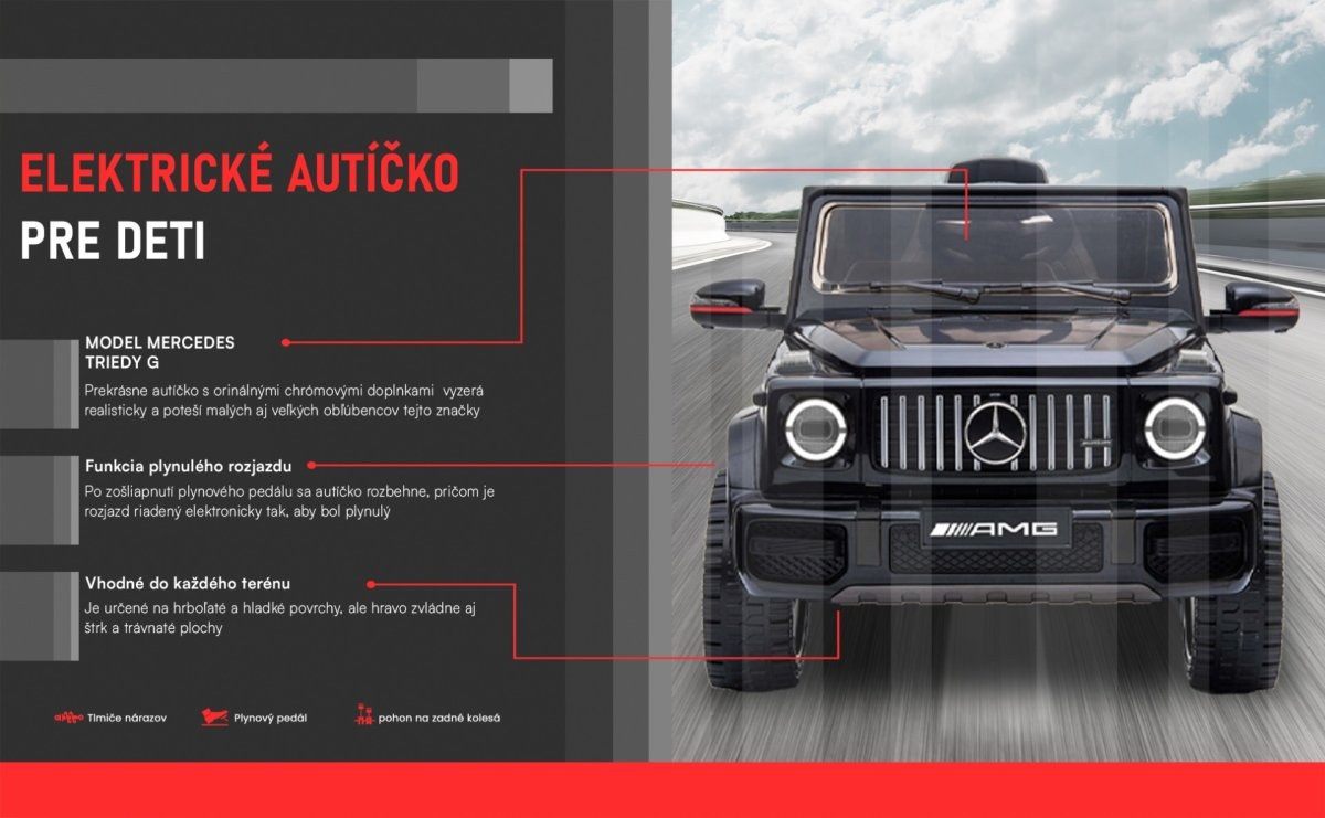 Elektrické autíčko Mercedes G s licenciou. Autíčko je veľmi pekné, je určené na hrboľaté a hladké povrchy, ale hravo zvládne aj štrk a trávnaté plochy. Dizajnom zodpovedá originálu Mercedes G.Autíčko je vybavené zvukovými a svetelnými efektmi. Prekrásne autíčko s originálnymi chrómovými doplnkami vyzerá realisticky a poteší malých aj veľkých obľúbencov tejto značky. Možnosť voľby z 3 rýchlostí priamo na diaľkovom ovládači. Taktiež obsahuje pokrokové diaľkové ovládanie s plnou kontrolou rodičov. Rodič má plnú kontrolu nad autíčkom, nakoľko diaľkové ovládanie je nadradené. Digitálny ukazovateľ stavu a nabitia batérií, pre bezpečnosť dieťaťa je na sedačke nastaviteľný bezpečnostný pás.
