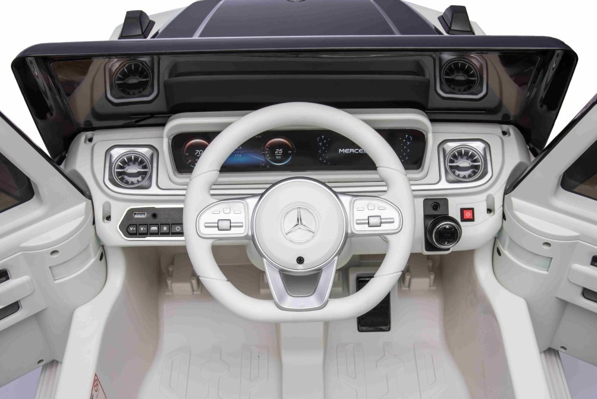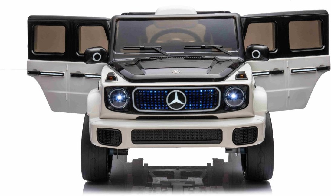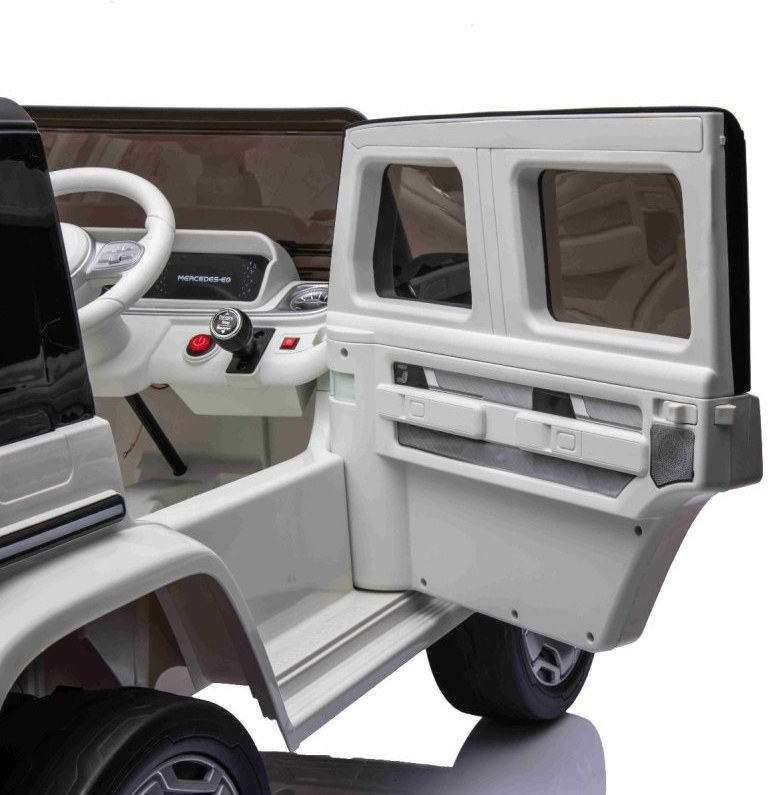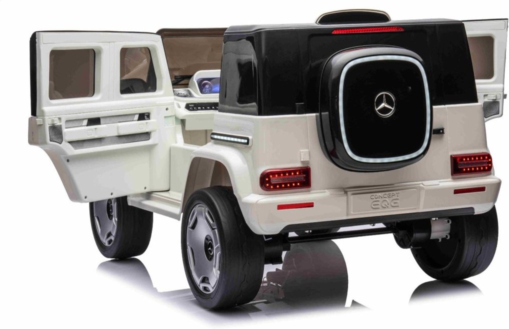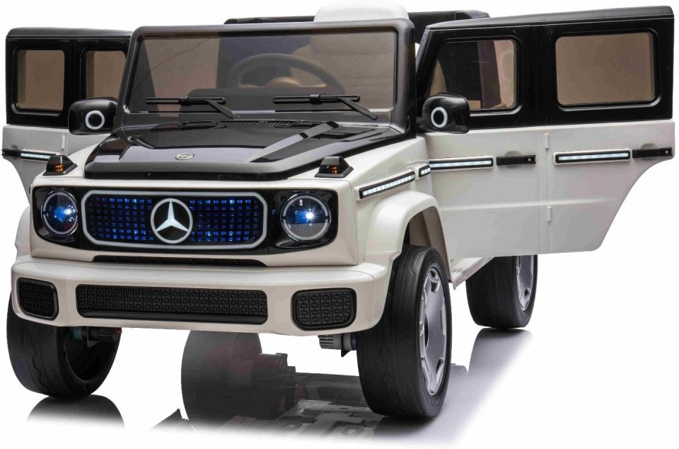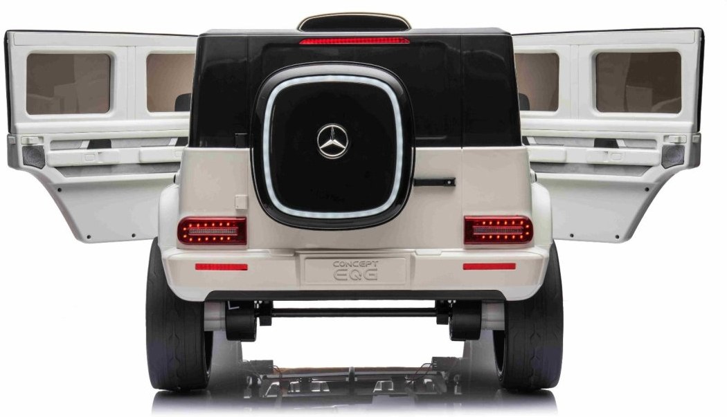 Najnovšie SUV od Mercedes-Benz triedy G v elektrickej verzii pre deti ponúka kombináciu luxusu a moderných technológií. Precízne spracovaný dizajn v štýle G-triedy s podsvietenými prvkami karosérie je doplnený s funkciami ako MP3 prehrávač s USB/AUX vstupom, s možnosťou ovládať hlasitosť priamo na prehrávači alebo na volante. K dispozícii je aj zapínanie predných LED svetlometov v rátane zadných svetiel a ukazovateľ stavu kapacity batérie na multimediálnom MP3 Prehrávači, ktorý ukazuje výdrž vo voltoch.Vďaka detailnému spracovaniu funkčných podsvietení model vyzerá absolútne realisticky a je identická zmenšená verzia originálu. Toto autíčko je vybavené 2,4 GHz diaľkovým ovládaním novej generácie s osvetleným štartovacím spínačom na jedno tlačidlo. Bezpečnosť zabezpečuje núdzová brzda na ovládači, ktorá okamžite deaktivuje všetky funkcie a umožní rodičovi plnú kontrolu nad jazdou. Nechýba ani bezpečnostný pás, ktorý zabezpečí stabilitu dieťaťa pri jazde. Pohon oboch zadných kolies zabezpečujú dva 35W motory, ktoré zabezpečujú stabilnú a pohodlnú jazdu. Autíčko disponuje elektrickou parkovacou brzdou a možnosťou jazdy vpred aj vzad.