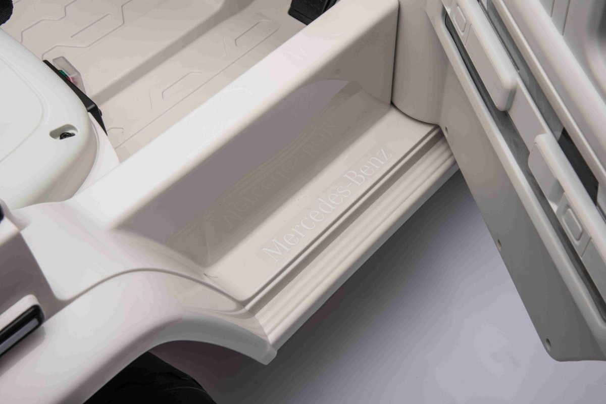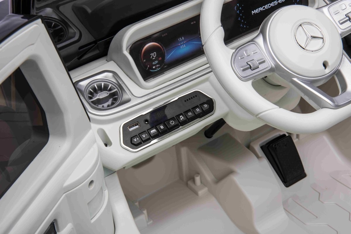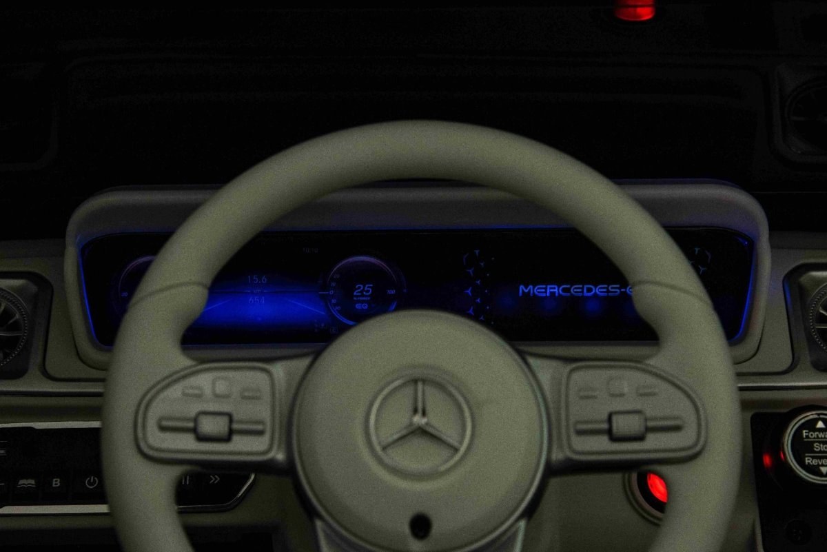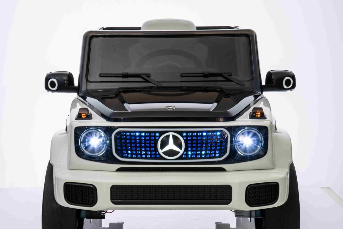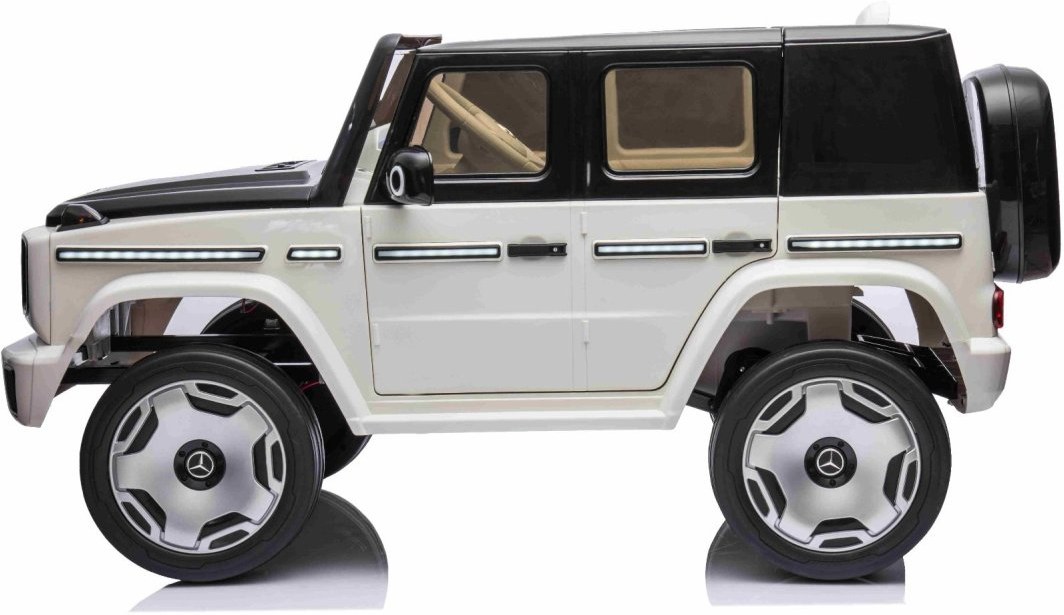 Najnovšie SUV od Mercedes-Benz triedy G v elektrickej verzii pre deti ponúka kombináciu luxusu a moderných technológií. Precízne spracovaný dizajn v štýle G-triedy s podsvietenými prvkami karosérie je doplnený s funkciami ako MP3 prehrávač s USB/AUX vstupom, s možnosťou ovládať hlasitosť priamo na prehrávači alebo na volante. K dispozícii je aj zapínanie predných LED svetlometov v rátane zadných svetiel a ukazovateľ stavu kapacity batérie na multimediálnom MP3 Prehrávači, ktorý ukazuje výdrž vo voltoch.Vďaka detailnému spracovaniu funkčných podsvietení model vyzerá absolútne realisticky a je identická zmenšená verzia originálu. Toto autíčko je vybavené 2,4 GHz diaľkovým ovládaním novej generácie s osvetleným štartovacím spínačom na jedno tlačidlo. Bezpečnosť zabezpečuje núdzová brzda na ovládači, ktorá okamžite deaktivuje všetky funkcie a umožní rodičovi plnú kontrolu nad jazdou. Nechýba ani bezpečnostný pás, ktorý zabezpečí stabilitu dieťaťa pri jazde. Pohon oboch zadných kolies zabezpečujú dva 35W motory, ktoré zabezpečujú stabilnú a pohodlnú jazdu. Autíčko disponuje elektrickou parkovacou brzdou a možnosťou jazdy vpred aj vzad.