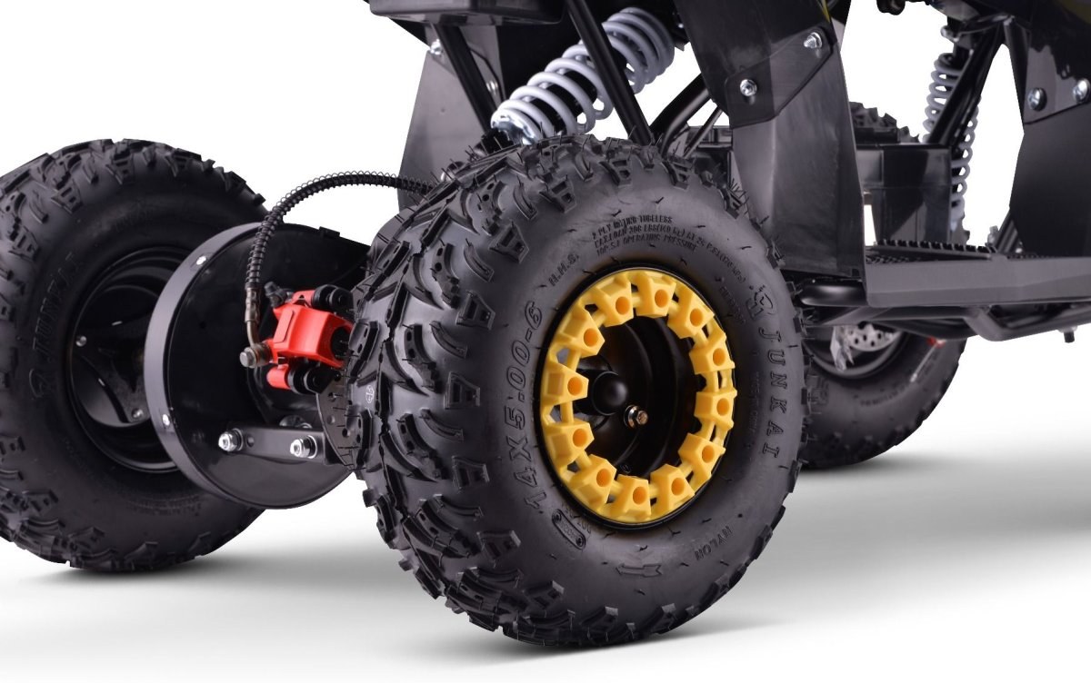 Prevrátená vidlica a nastaviteľný zadný tlmič poskytujú optimálny komfort aj na ťažkých terénoch. Oceľový rám zabezpečuje maximálnu odolnosť za všetkých podmienok. S batériou 36V (3x 12V 12Ah) tento elektrický quad ponúka približne 1 hodinu nepretržitej jazdy, čo umožňuje deťom vychutnať si jazdu bez prerušenia.1000W elektrický motor: Ponúka plynulé zrýchlenie a vzrušujúci zážitok aj pre skúsenejších jazdcov.