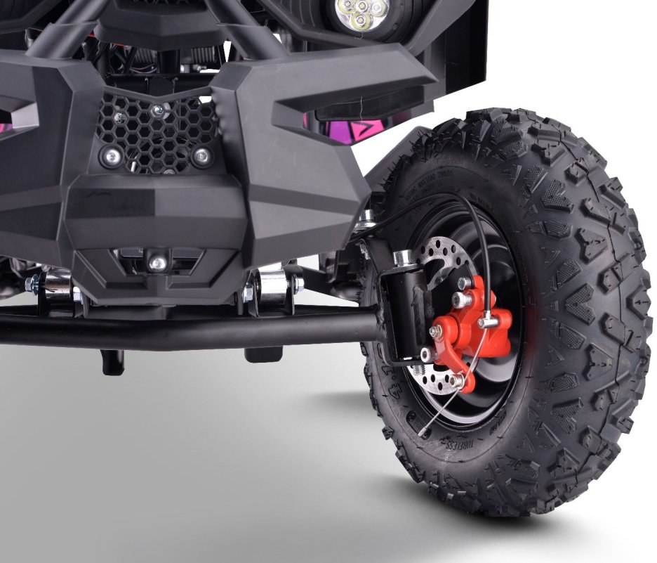 Bezpečnosť je pre nás na prvom mieste, a preto je tento model vybavený pevným a odolným rámom, širokým rozpätím kolies s nízkym ťažiskom, aby sa predišlo prevráteniu, nastaviteľným obmedzovačom rýchlosti a spoľahlivými brzdovými systémami. 3-polohový obmedzovač rýchlosti (5-15-25 km/h). Žiadny zápach z výfukov, žiadny hluk v porovnaní s benzínovými offroadmi.Ostrý, štýlový dizajn