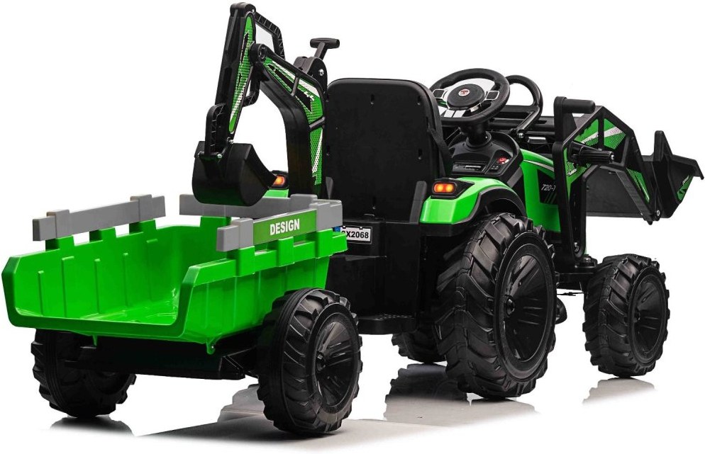 Zadný pohon - Pohon zabezpečujú dve zadné 45W Motory na kolesách vďaka čomu je traktor vhodný aj do mierneho terénu. Možnosť aj pre menšie deti – vďaka nastaveniu nižšej rýchlosti a plynulému rozbehu !