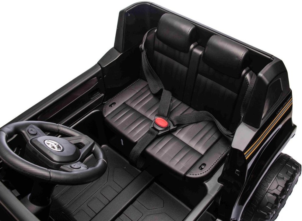 S tlačidlami na ovládanie klaksónu a prepínanie hudby.Autíčko je vybavené 2,4 GHz diaľkovým ovládaním novej generácie s osvetleným štartovacím spínačom na jedno tlačidlo. O bezpečnosť sa stará núdzová brzda na ovládači, ktorá v prípade potreby okamžite deaktivuje všetky funkcie, a tak rodič získava plnú kontrolu nad jazdou. Nechýba ani bezpečnostný pás, ktorý poskytuje istotu pri jazde.