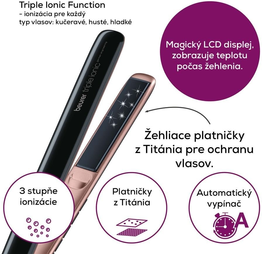 Doprajte si dostupnú kvalitu, úžasný výkon, krásny dizajn, svelé výsledky prostredníctvom žehličiek na vlasy Beurer. A nezáleží na tom, či máte kučeravé alebo vlnité vlasy. S Beurerom dosiahnete optimálny výsledok!