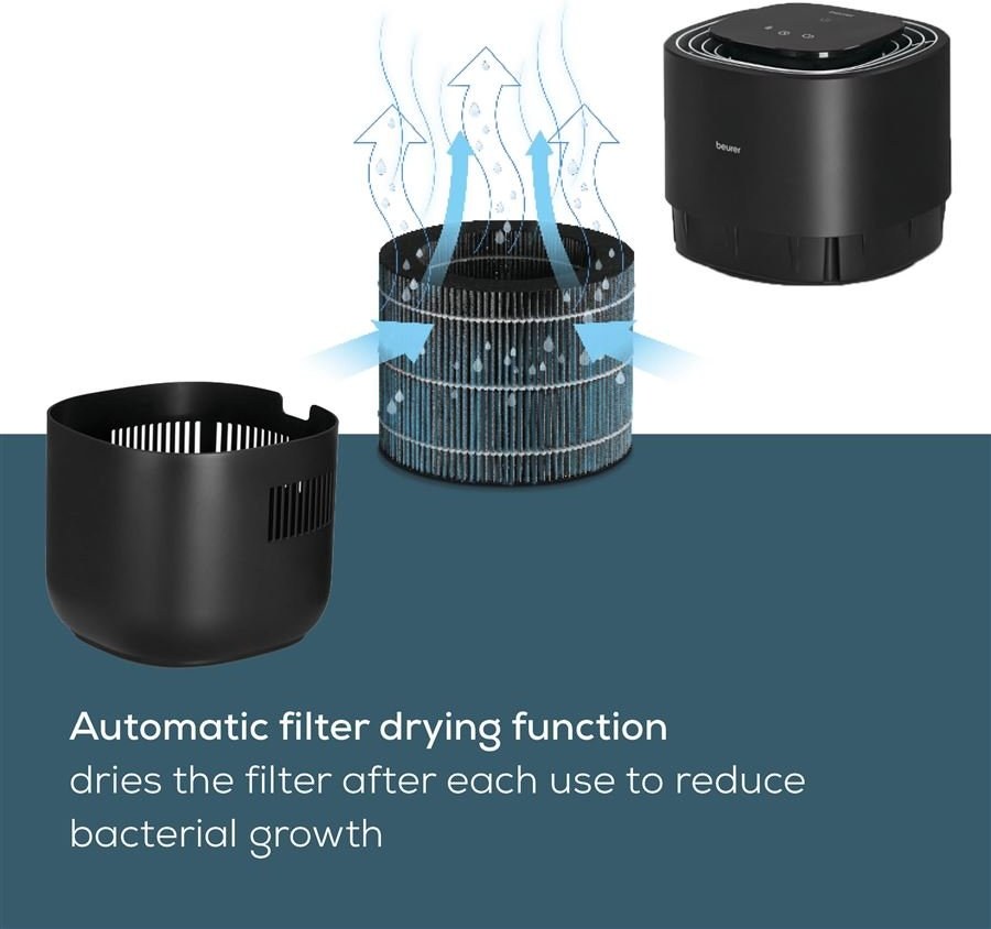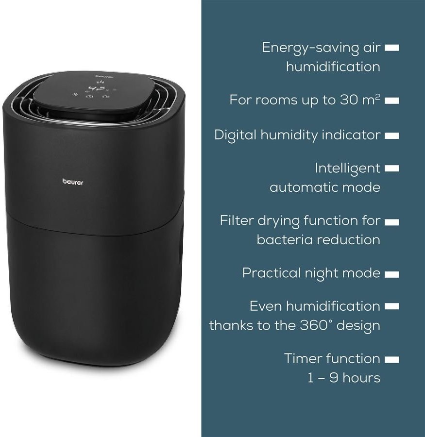 Zdravý okolitý vzduch pre zdravé hlboké nádychy, to sú zvlhčovače vzduchu od svetovo uznávanej nemeckej spoločnosti Beurer. Relatívna vlhkosť 40 až 60% je nevyhnutná pre pohodlné bývanie a svieže pracovné prostredie. Relatívna vlhkosť často klesá pod tento odporúčaný percentuálny podiel pri používaní vykurovania alebo počas suchých dní. Beurer LB200 uvoľňuje hygienicky zvlhčený vzduch do prostredia a tým zlepšuje kvalitu vášho vnútorného prostredia!
