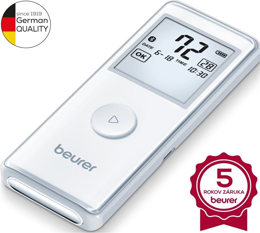 Pomocou tohto mobilného zariadenia EKG môžete ľahko zaznamenávať a monitorovať srdcový rytmus doma alebo na cestách. Údaje je možné preniesť na váš smartphone cez Bluetooth® a vyhodnotiť ich v sprievodnej aplikácii „beurer CardioExpert“.
