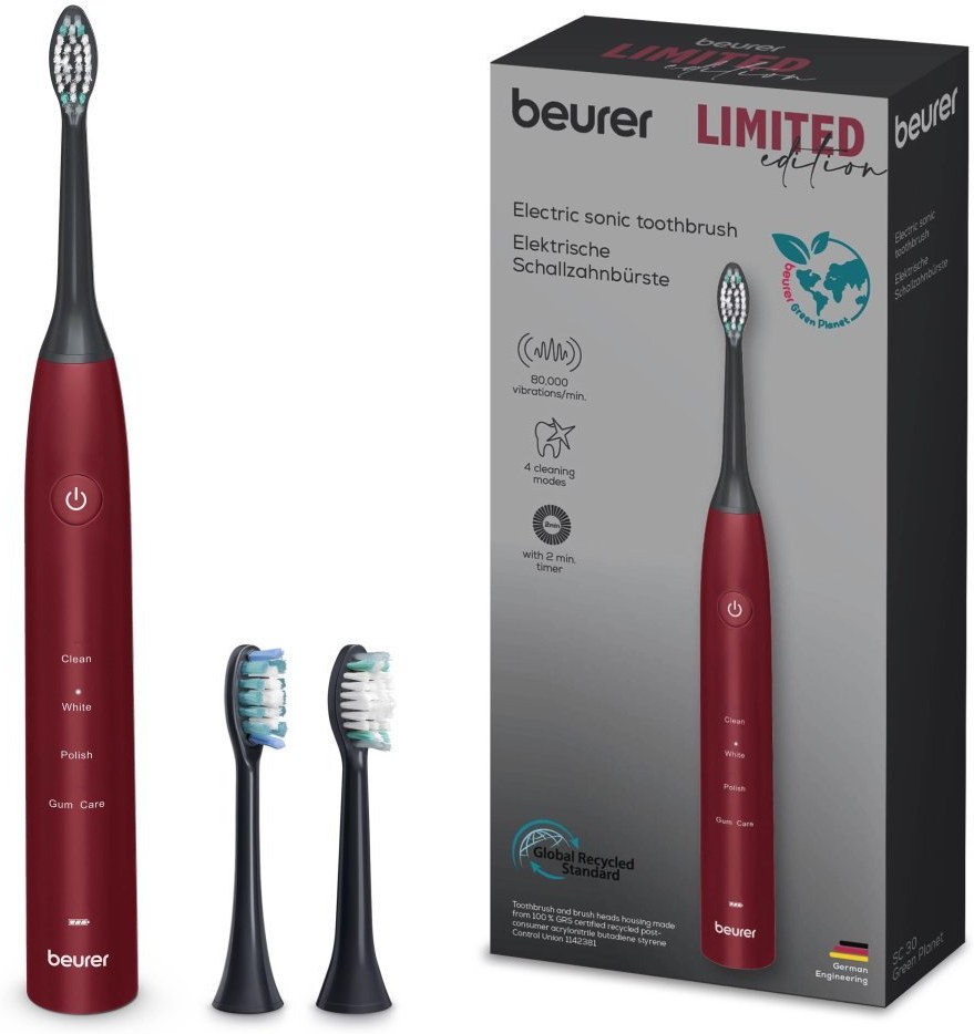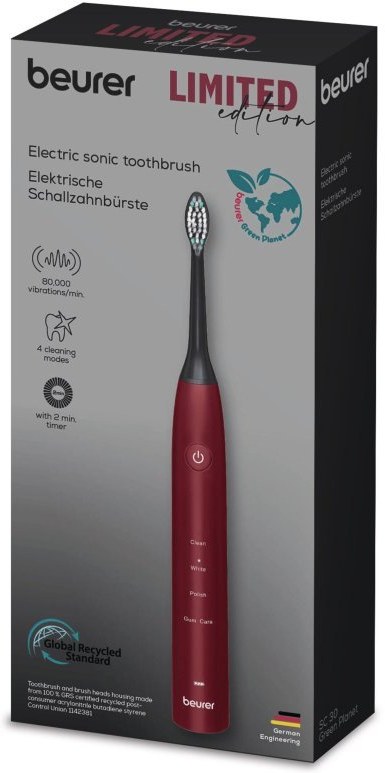 Elektrická sonická zubná kefka Beurer SC 30 Green Planet Limited Edition 25 ponúka až 80 000 pohybov za minútu pre dôkladnú, no zároveň šetrnú starostlivosť o zuby a ďasná. 4 režimy čistenia umožňujú prispôsobiť ústnu hygienu podľa vašich potrieb. Praktický LED displej a akustický 30-sekundový kvadrantový časovač zabezpečujú rovnomerné a efektívne čistenie každej časti ústnej dutiny.Ekologický dizajn