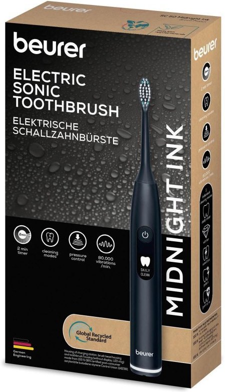 BEURER SC50 Green Planet je vyrobená zo 100 % recyklovaných materiálov – puzdro kefky, kefkové hlavy aj nabíjacia základňa (bez displeja a LED krúžku). Štetiny sú zo 100 % obnoviteľných materiálov, čím kefka predstavuje ekologickejšiu voľbu pre každodennú starostlivosť o ústnu hygienu.Technické parametre a funkcie