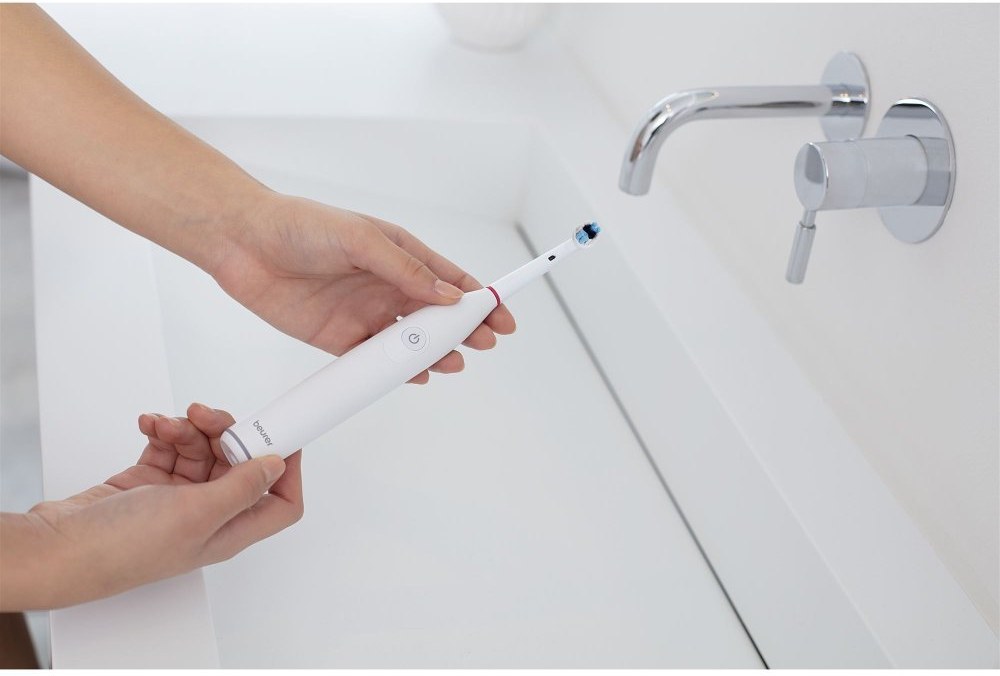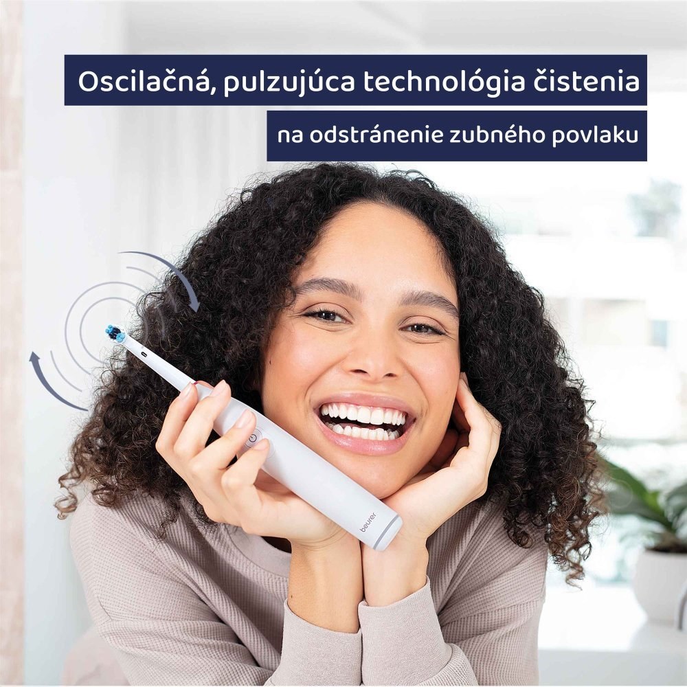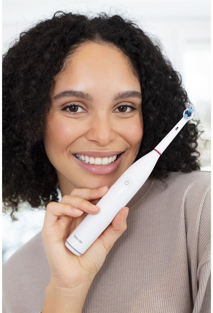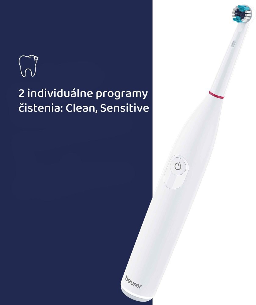 S elektrickou zubnou kefkou Beurer TB30 si môžete čistiť zuby pomocou oscilačnej a pulzujúcej technológie. 2-minútový časovač vám pomôže čistiť si zuby dostatočne dlho. Batéria s výdržou až 20 dní uľahčuje čistenie zubov na cestách. Elektrická zubná kefka Beurer TB30 disponuje dvoma individuálnymi programami čistenia, "Clean" a "Sensitive". Program "Clean" je ideálny pre efektívne odstránenie zubného povlaku, zatiaľ čo program "Sensitive" je šetrnejší a určený pre tých, ktorí potrebujú starostlivú ústnu hygienu.Charakteristika a technické údaje:
