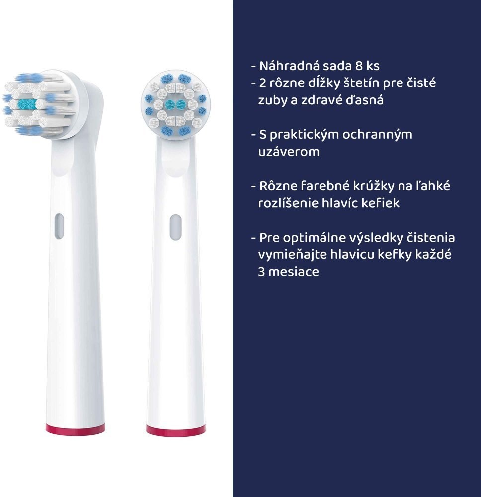 Náhradné kefky BEURER Sensitive kompatibilné so zubnými kefkami BEURER TB30 / TB50 aj so všetkými štandardnými rotačnými zubnými kefkami (napr. Oral-B).- Náhradná sada 8 ks