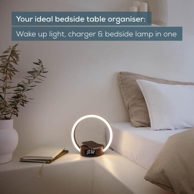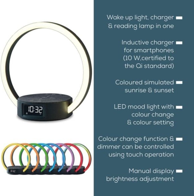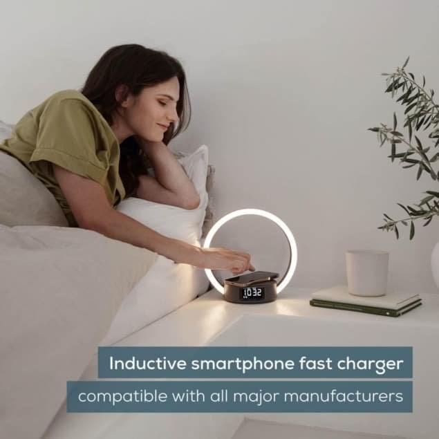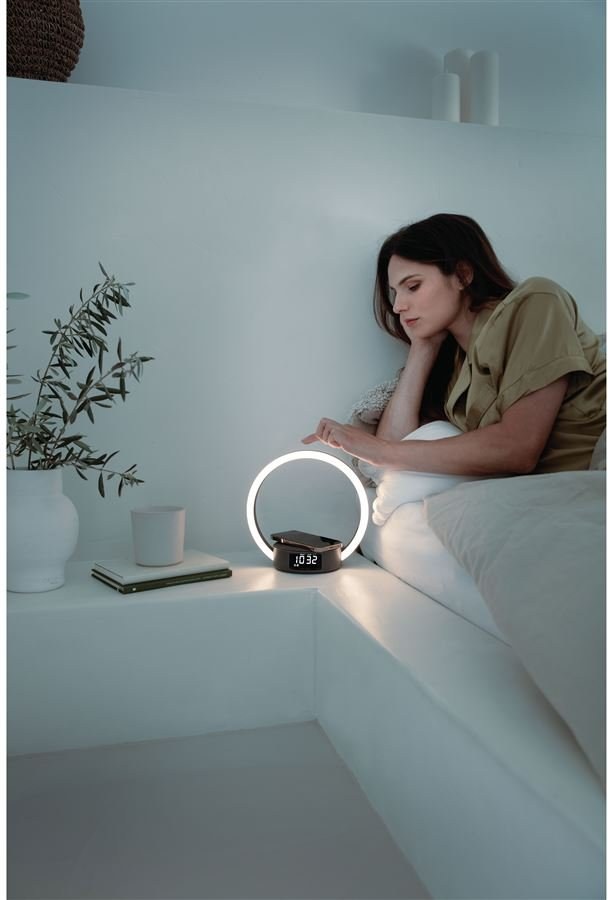 Budík ponúka nastavenie dvoch samostatných časov budenia, praktickú funkciu odloženia budenia v rozmedzí od 1 do 30 minút a možnosť zmeny farby osvetlenia podľa nálady. Integrovaná indukčná rýchlonabíjacia stanica pritom umožňuje bezpečné a energeticky úsporné nabíjanie vášho smartfónu priamo na nočnom stolíku.