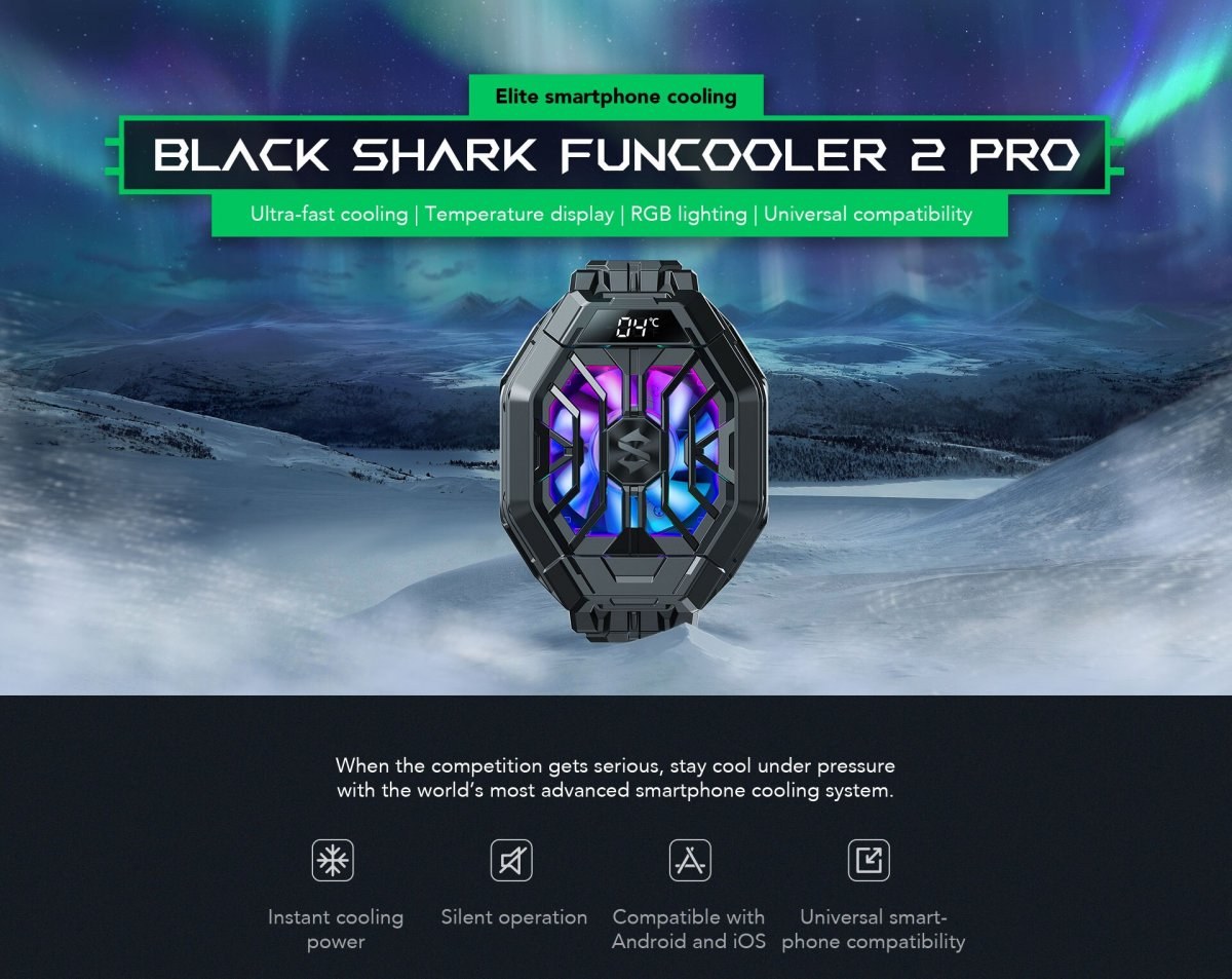 Vyvinutý z najkvalitnejších materiálov , mimoriadne širokej kontaktnej plochy a 7 mimoriadne tichých lopatiek, Black Shark Fancooler 2Pro má výkon na okamžité ochladenie tvojho mobilného telefónu. Okrem toho pomocou inteligentnej regulácie teploty Fancooler 2Pro automaticky reguluje rýchlosť ventilátora.Displej zobrazujúci aktuálnu teplotu prístroja