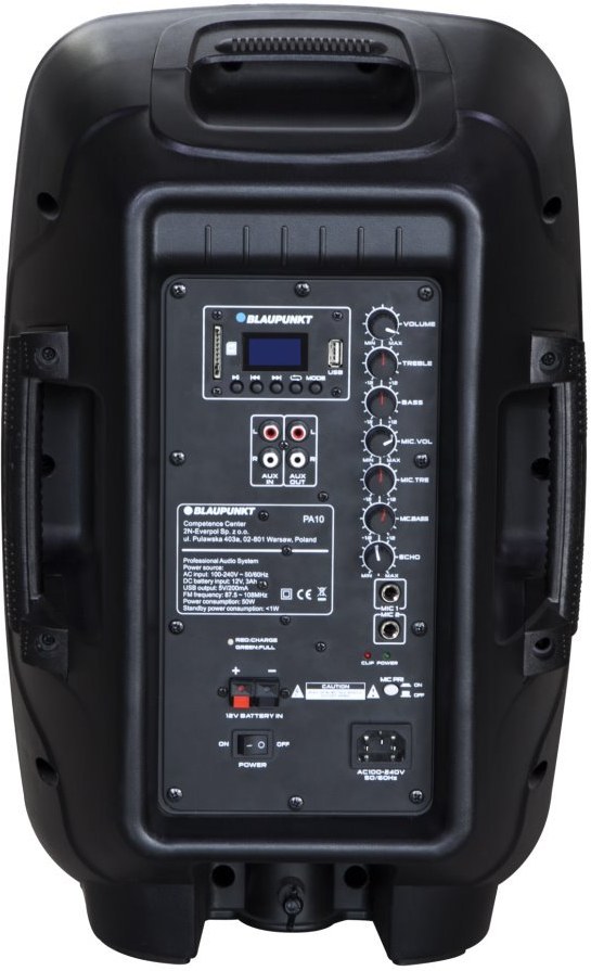 Profesionálny audio systém Blaupunkt PA10 je produkt navrhnutý tak, aby spĺňal očakávania aj tých najnáročnejších užívateľov, ktorí oceňujú vynikajúcu kvalitu zvuku v akomkoľvek prostredí. Pevná konštrukcia, veľmi výkonný zosilňovač a vysoko kvalitná membrána reproduktora sú len niektoré z výhod tohto produktu, vďaka ktorým sa perfektne hodí do vašej firmy, posilňovne, SPA salónu alebo kdekoľvek, kde si radi vypočujete svoju obľúbenú hudbu.BEZDRÔTOVÉ NAPÁJANIE