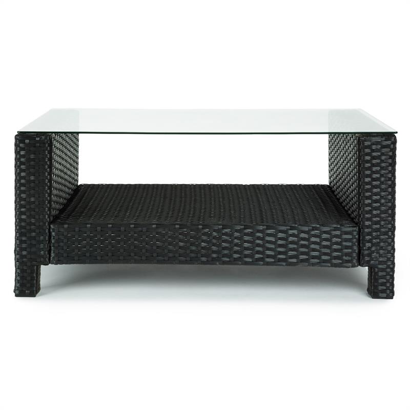 Odolná voči poveternostným vplyvom a stabilná: Pozinkovaný a práškovou farbou natretý oceľový rám s poťahom z UV-rezistentného polyratanu a sklenená doska konferenčného stolíka.