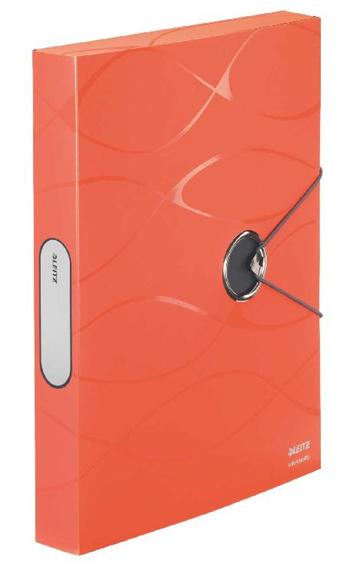 Nepriehľadný polypropylénový box na prenos objemnejších spisov, cenníkov, katalógov a pod. do formátu A4. Vonkajší povrch farebný a matný s plastickým vzorom vĺn, vnútorný povrch kontrastnej antracitovej farby. Na prednej chlopni vrecko na CD, praktické zatváranie gumičkou na kovový krúžok. Šírka boxu 4 cm. Väčšie balenie 10 ks.Farba: oranžová