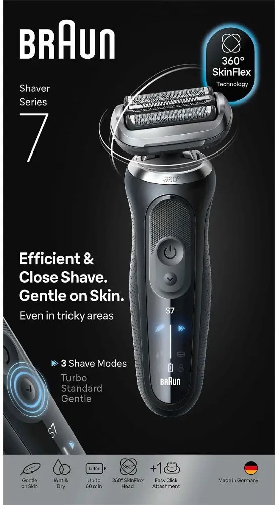 Braun Series 7 Wet&Dry 72-N4200S má cestovné puzdro, nabíjací stojan, napájací kábel a presný zastrihávač EasyClick na strihanie fúzov, kotlety alebo brady pod nosom. Praktická čistiaca kefa vám umožní rýchlo odstrániť zvyšky chĺpkov a zabezpečí dlhú životnosť strojčeka.