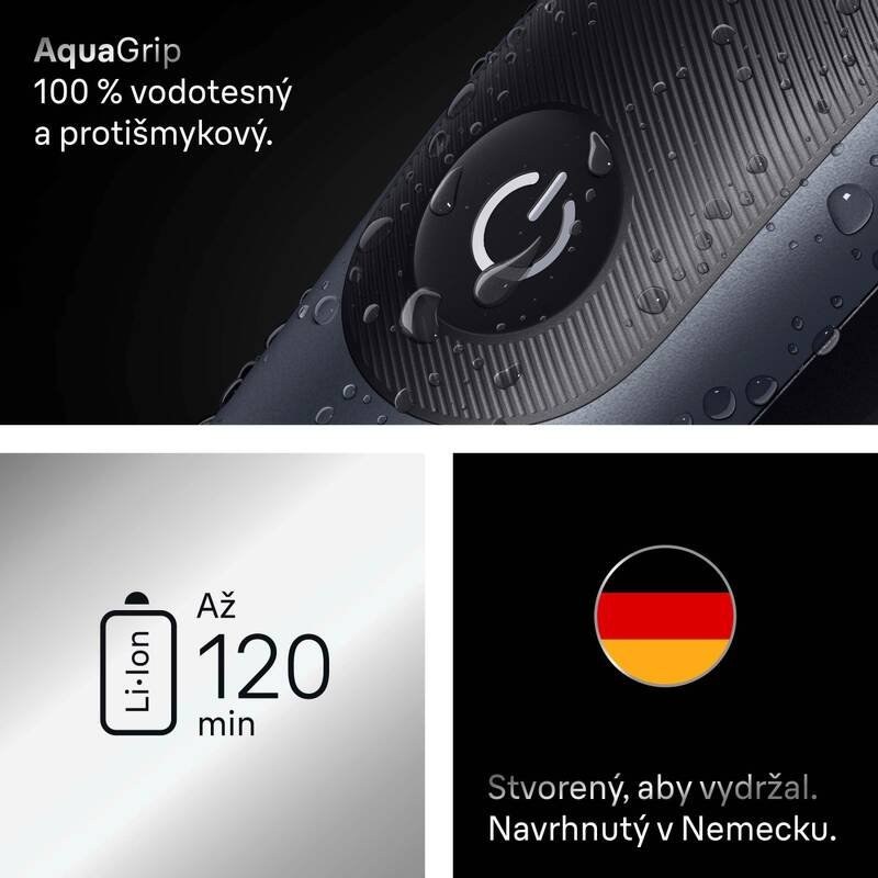 Vodotesné telo a protišmyková rukoväť AquaGrip umožňujú pohodlné a bezpečné použitie aj počas sprchovania. Čistenie zastrihávača pod tečúcou vodou je ľahké a rýchle, čo výrazne uľahčuje jeho údržbu.