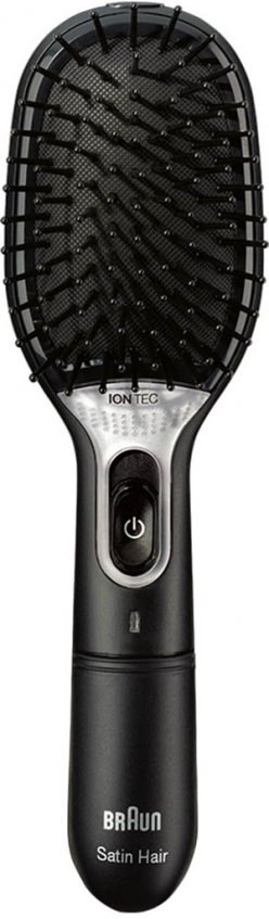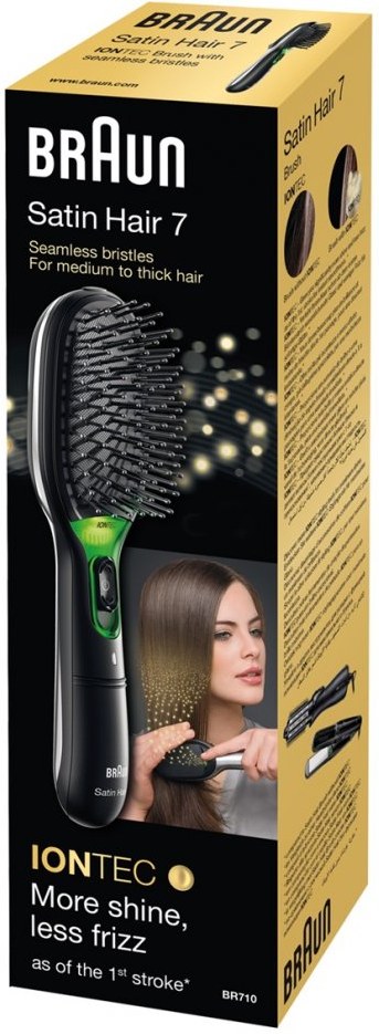 Kefa na vlasy s ionizačnou technológiou, technológia "Satin ion" - neutralizuje elektrizovanie vlasov a zvyšuje lesk a zdravý vzhľad vlasov, hladké zakončenie pichliače, spínač On-Off s automatickým vypínaním, batériový prevádzku, 2AAA batérieuk.braun.com/en-gb/products/hair-care/brushes/satin-hair-7-br710-brush-iontec