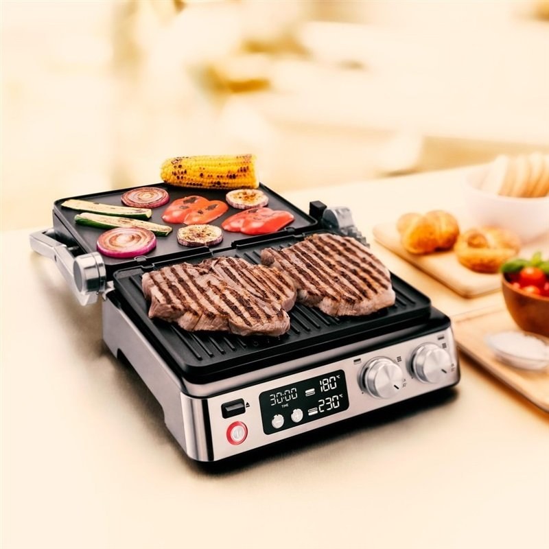 kontaktný elektrický gril, príkon 2000 W, 2 nezávisle termostaty, 2x rebrovaná, 2x hladká grilovacia platňa, 3 polohy grilovania, max. teplota 230°CZobraziť viac