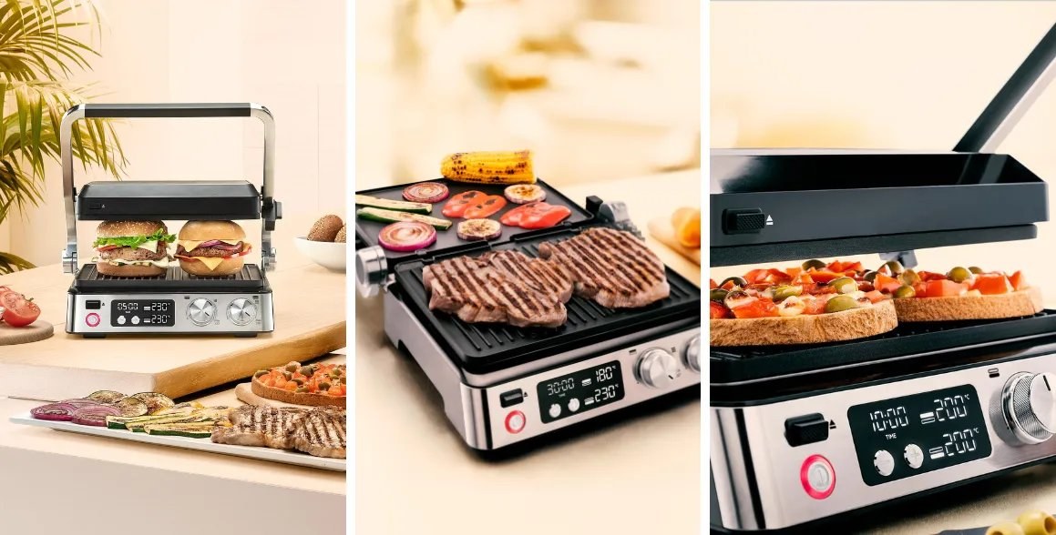 Dokonalú chuť hamburgerov dosiahnete použitím kontaktnej polohy, zatiaľ čo otvorená poloha vám umožní pripravovať na 2 plochách súbežne 2 rôzne jedlá, každé s vlastnou teplotou.