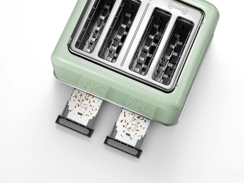 Hriankovač je vybavený praktickými výsuvnými miskami na omrvinky umiestnenými v zadnej časti, ktoré sa dajú bez námahy vybrať a vyčistiť. Tento premyslený konštrukčný prvok umožní ľahšie odstránenie omrviniek a zvyškov, čím sa zabráni ich hromadeniu a zachová sa výkon hriankovača. Toto jedinečné riešenie udrží váš hriankovač dlho v excelentnom stave.