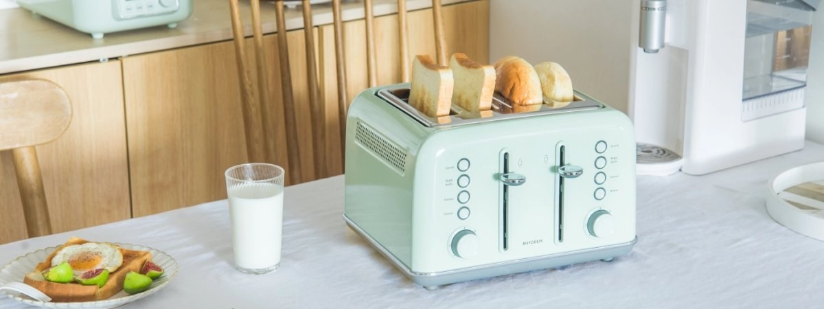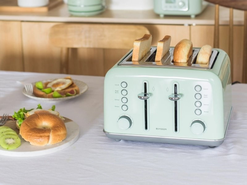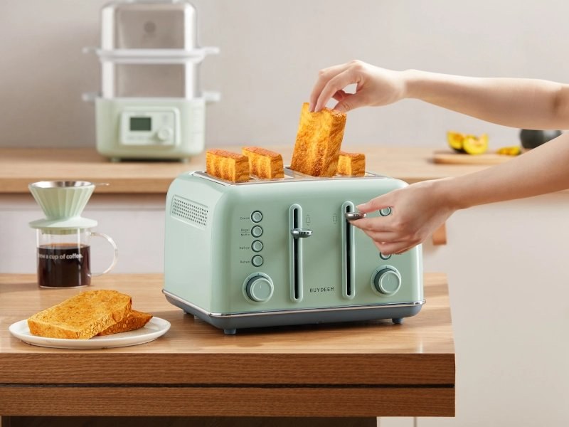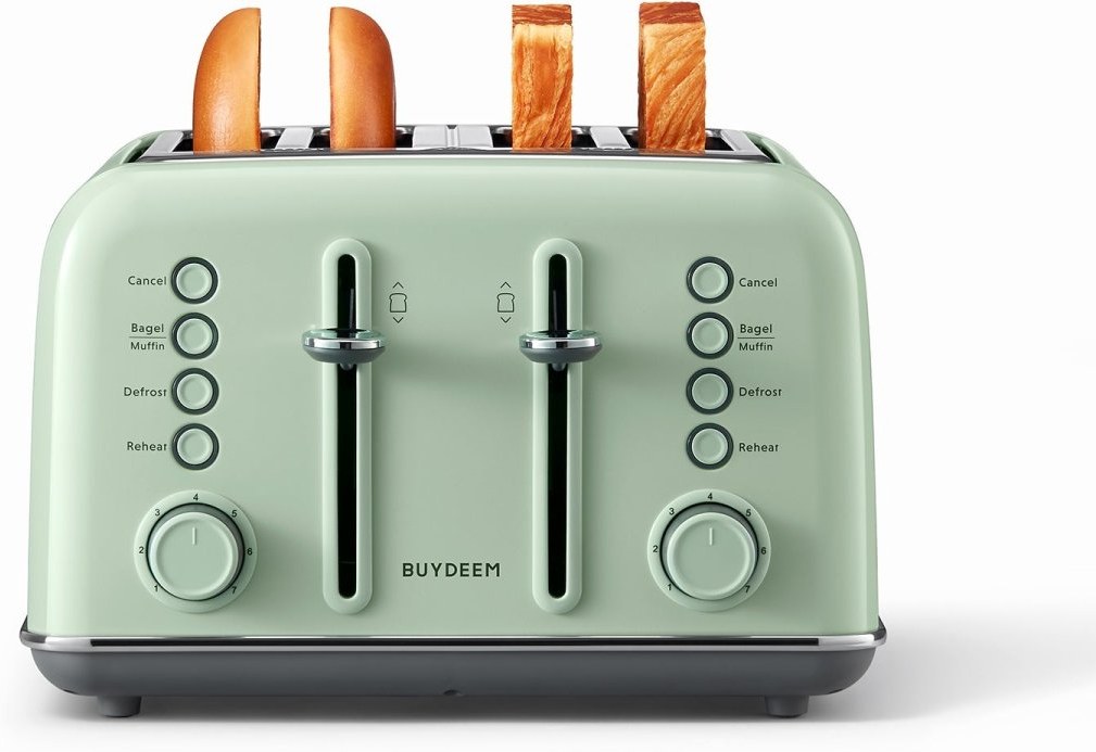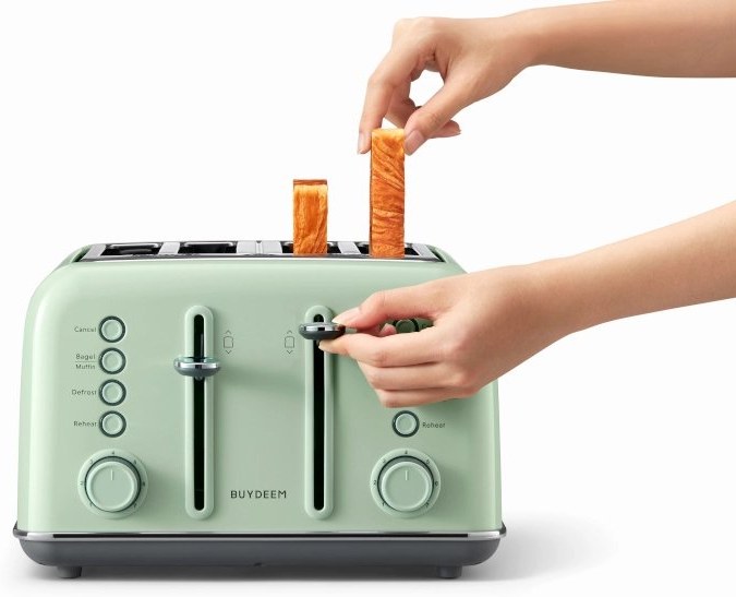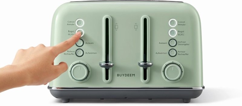Jednoduché použitieJedno otočenie a jedno stlačenie šetrí čas a námahu. Tlačidlá s kontrolkou LED a zrozumiteľný ovládací prvok režimu. Naštartujte deň dokonalou hriankou z hriankovača BUYDEEM. Retro kovový hriankovač na 4 hrianky s extra širokými otvormi na opekanie rôznych bagelov a muffinov. Vychutnajte si teplý chlieb, bagel alebo ho použite na prípravu chutného sendviča.
