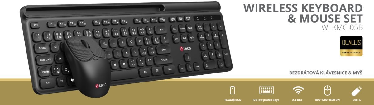 C-Tech Quallis WLKMC-05, bezdrôtový combo set klávesnica a myš, USB, CZ/SK, čierny