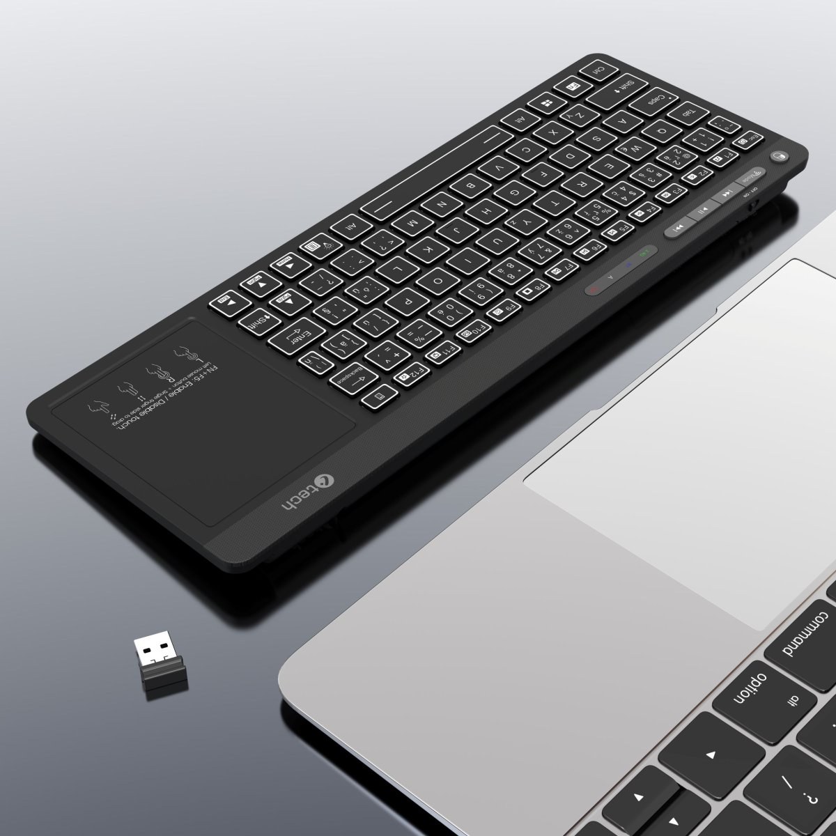 Klávesnica obsahuje plnohodnotný touchpad, ktorý úplne nahrádza externú myš. Môžete tak ovládať kurzor, klikanie aj základné gestá priamo z klávesnice – čo je praktické najmä pri ovládaní inteligentnej TV, tabletu alebo pri práci v obmedzenom priestore.Výkonná batéria a moderné USB-C nabíjanie