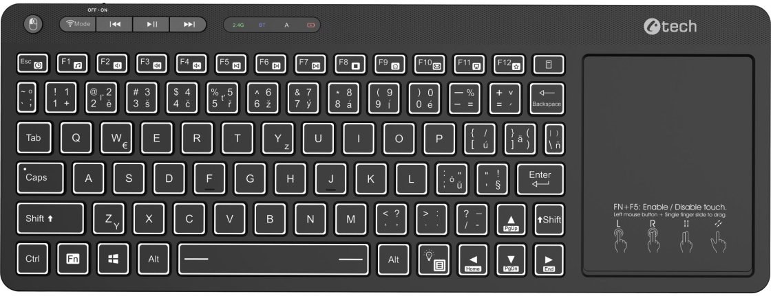 C-Tech WLTK-03 Dual mode, bezdrôtová klávesnica s touchpadom, BT5.0 + 2,4GHz, čierna