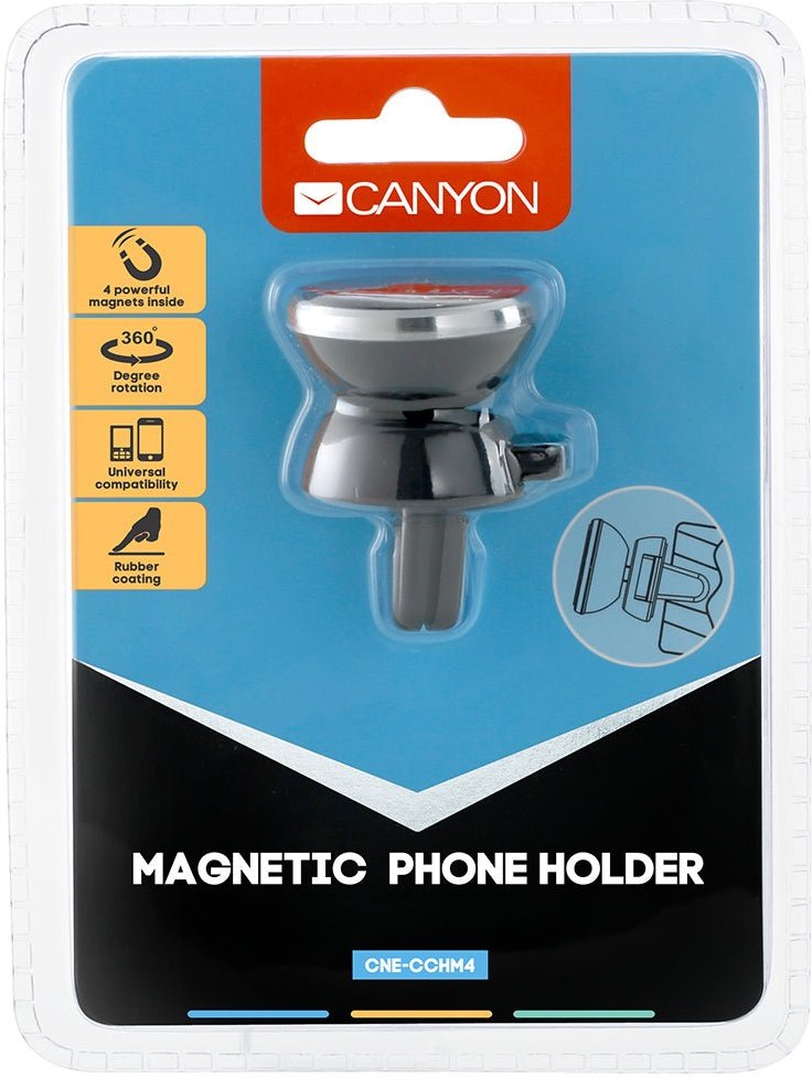 Canyon CNE-CCHM4 magnetický držiak pre smartfóny s uchytením do mriežky ventilátora automobilu s tlačidlom pre aretáciu a možnosťou polohovania 360°.Ubezpečte sa, že na displej Vášho telefónu dobre vidíte a máte ho vždy v dosahu počas šoférovania Vášho auta. Nainštalujte jednoducho tento kompaktný držiak do mriežky ventilátora automobilu. Použite integrované tlačidlo pre uzamknutie. Smartfón umiestnite na plochu držiaka, pričom jeho 4 silné magnety pevne zafixujú Váš smartfón s možnosťou polohovania v rozsahu 360 stupňov. Súčasťou balenia sú 2 samolepiace kovové plátky, ktoré zabezpečia kompatibilitu so všetkými súčasnými smartfónmi.