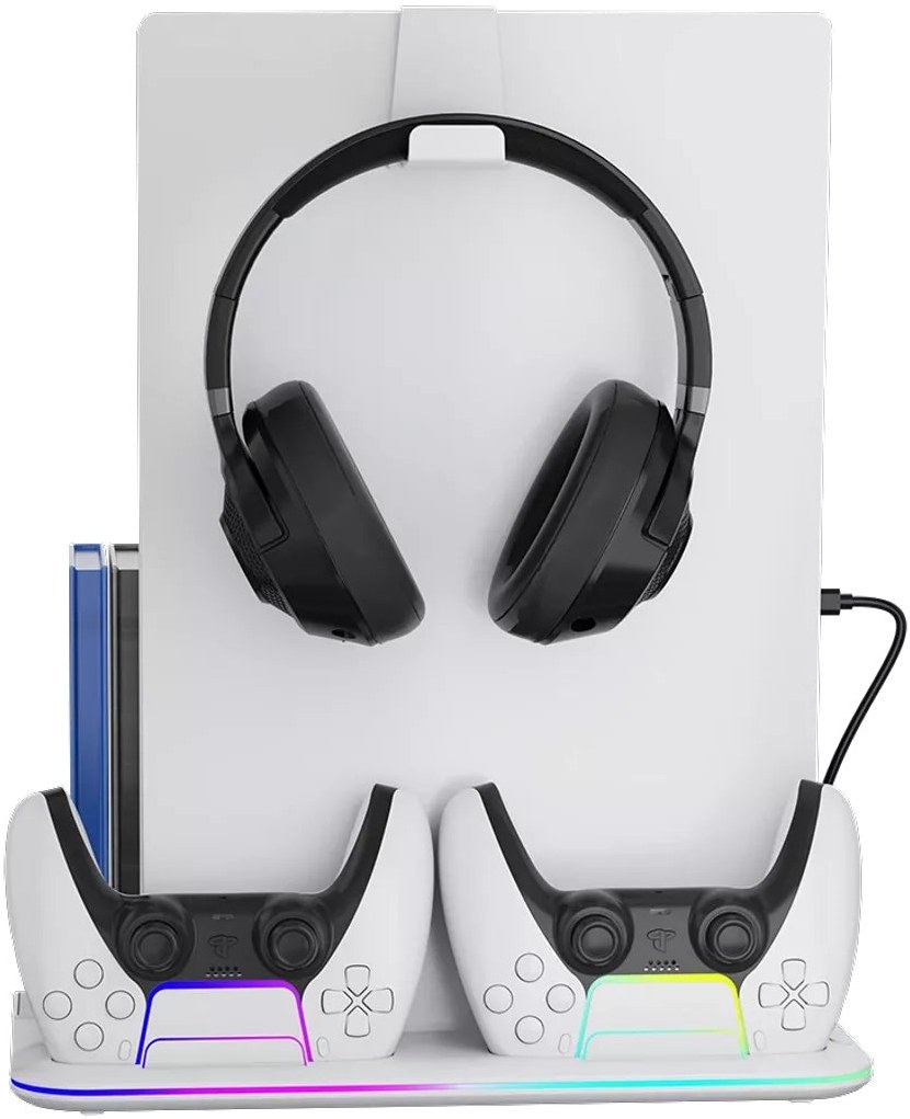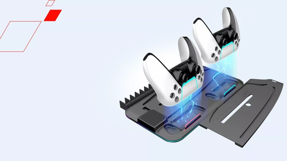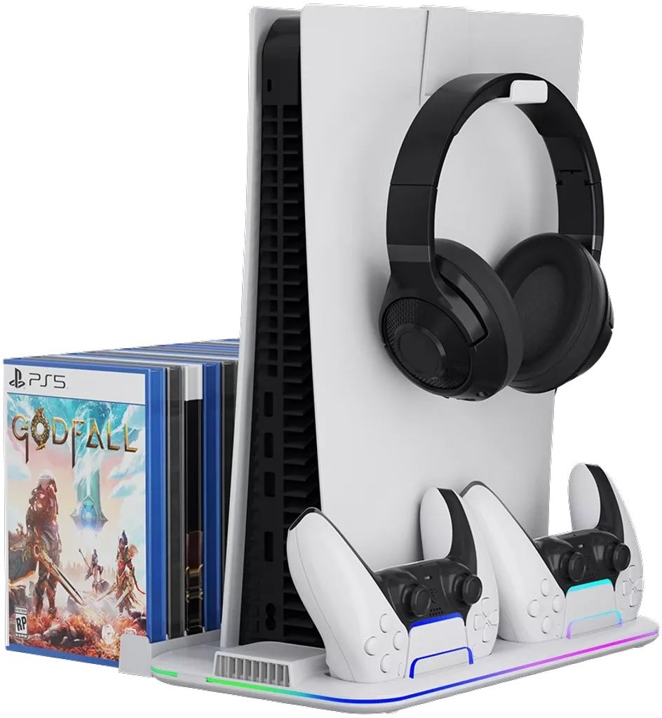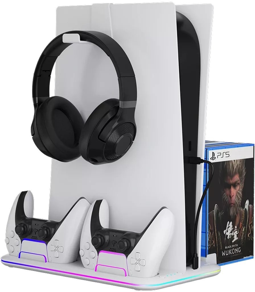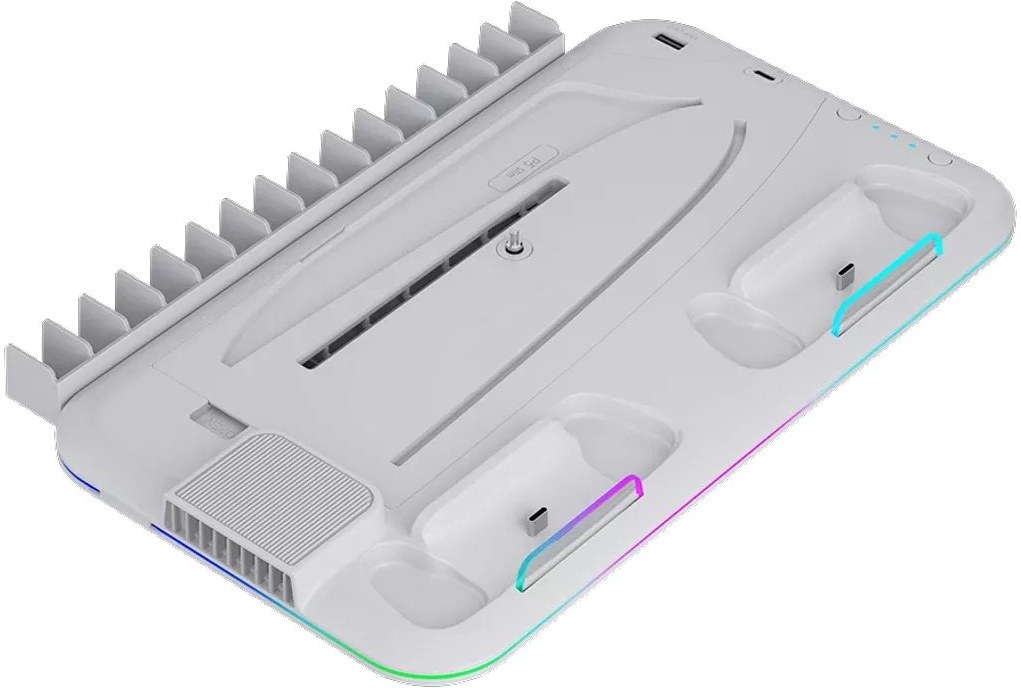 Typ: multifunkčný stojan Kompatibilita: PlayStation 5, PlayStation 5 Slim Chladenie: Vstavaný vysokorýchlostný ventilátor (až 5000 ot./min.) Nastavenie ventilátora: 3 úrovne rýchlosti Nabíjanie ovládačov: Súčasné nabíjanie 2x PS5 DualSense ovládačov Indikácia nabíjania: LED indikátory nabíjania