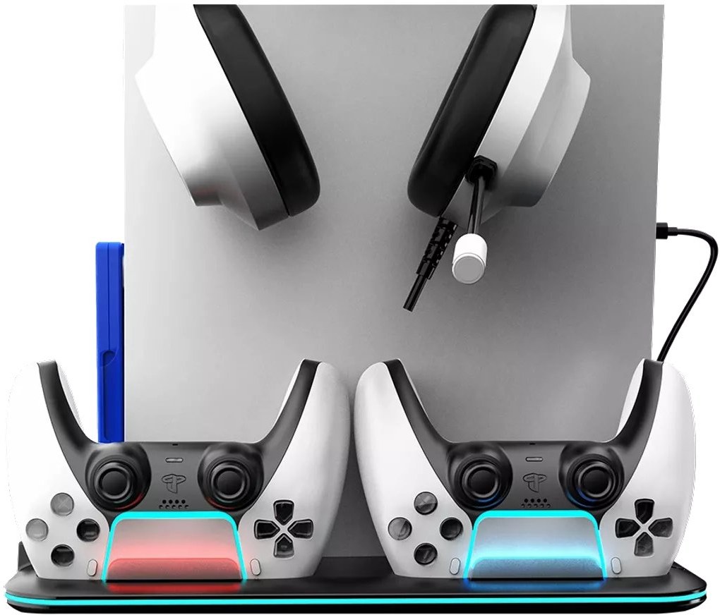 Stojan je vybavený dvoma nabíjacími stanicami pre ovládače DualSense, ktoré umožňujú ich súčasné nabíjanie. LED indikátory jasne zobrazujú stav nabitia, takže vždy viete, kedy sú vaše ovládače pripravené na ďalšiu akciu. Napájanie je zabezpečené cez USB-C kábel pripojený priamo ku konzole, čo zaručuje čisté a praktické riešenie bez zbytočných káblov.