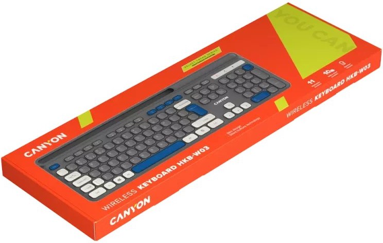 Bezdrôtová klávesnica Canyon HKB-W03 je navrhnutá pre tých, ktorí si cenia čistý pracovný priestor bez zbytočných káblov. Vďaka spoľahlivému 2,4 GHz pripojeniu cez USB prijímač ponúka stabilné spojenie aj na väčšiu vzdialenosť. Jej tenký a moderný dizajn v kombinácii s matným UV povrchom a laserovým gravírovaním z nej robí štýlový doplnok každého pracovného stola.