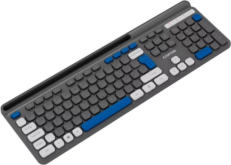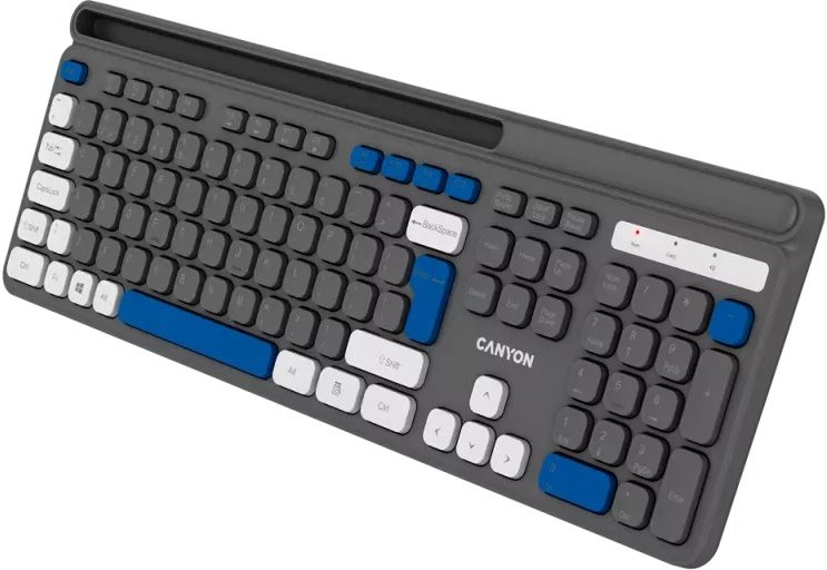Canyon HKB-W03 je nielen štýlová, ale aj ergonomická. Vďaka sklopným nožičkám s gumovou základňou si môžeš nastaviť ideálny uhol pre pohodlné písanie. Napájanie zabezpečuje jedna AAA batéria, čo znamená jednoduchú výmenu bez potreby nabíjania. Klávesnica je dostupná v dvoch farebných kombináciách – svetlosivá s oranžovými prvkami a tmavosivá s modrými detailmi.