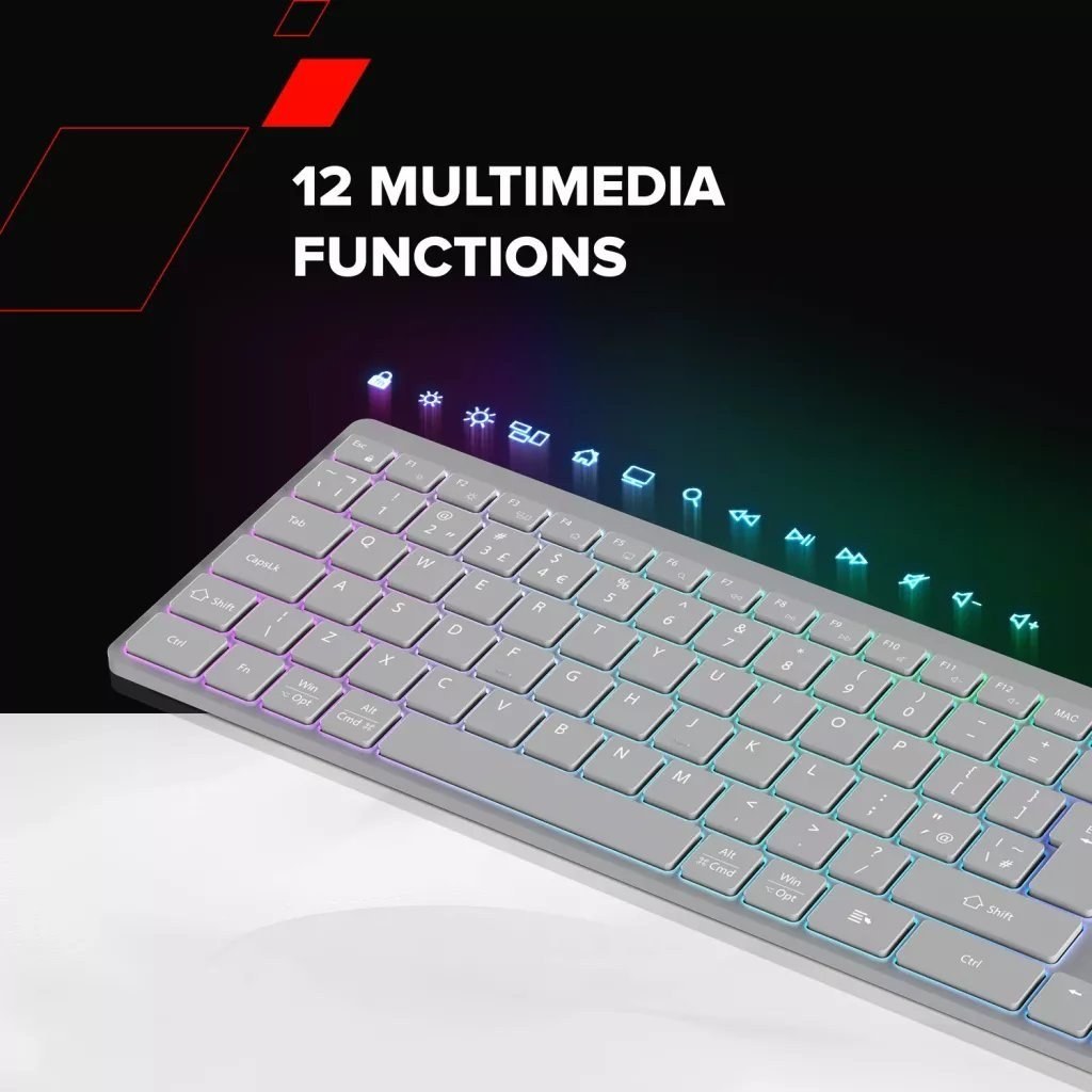 Multimediálne funkčné klávesy: 12 multimediálnych funkčných kláves pre rýchly prístup k ovládaniu hlasitosti, prehrávaniu a ďalším základným funkciám.