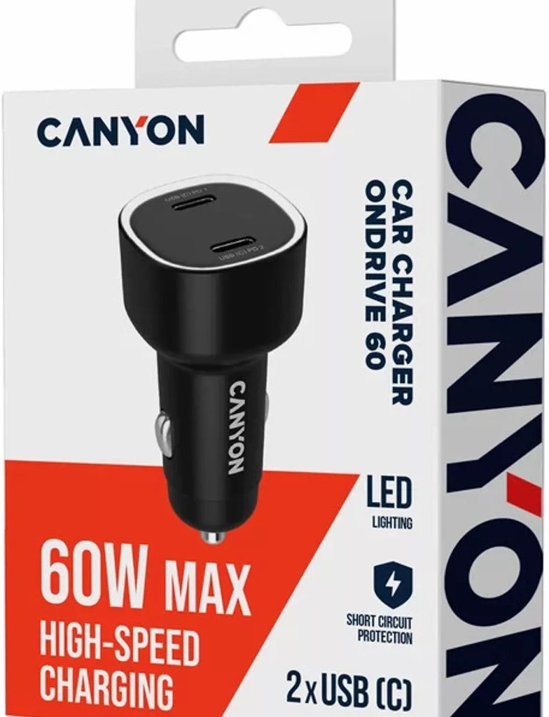 Canyon OnDrive 60, univerzálna autonabíjačka, 2x USB-C, rýchle nabíjanie, výkon 60 W