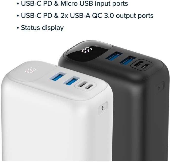 To je skutočná sila medzi power bankami! PB-301 uchováva neuveriteľných 30 000 mAh elektrickej šťavy pre vaše zariadenia. Má dva vstupné porty: Type-C a MicroUSB, ten druhý pre časy, keď ho potrebujete zachovať zo starej školy. Port USB-C je vstupný aj výstupný a je to Power Delivery – čo znamená, že svoju powerbanku môžete nabíjať rýchlejšie. Dva porty USB-A podporujú rýchle nabíjanie Quick Charge 3.0, vďaka čomu tri výstupné porty nabijú všetky vaše zariadenia trikrát rýchlejšie.