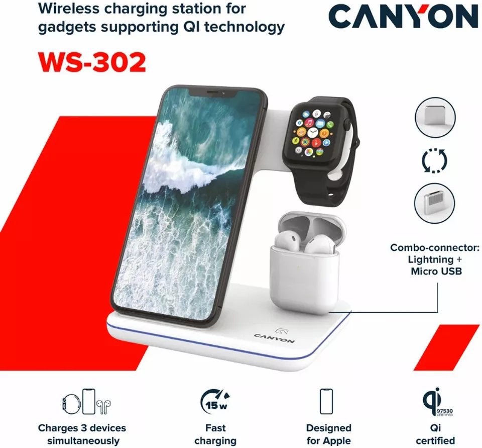 Canyon WS-302, bezdrôtová Qi nabíjacia stanica pre 3 zariadenia simultánne, biela