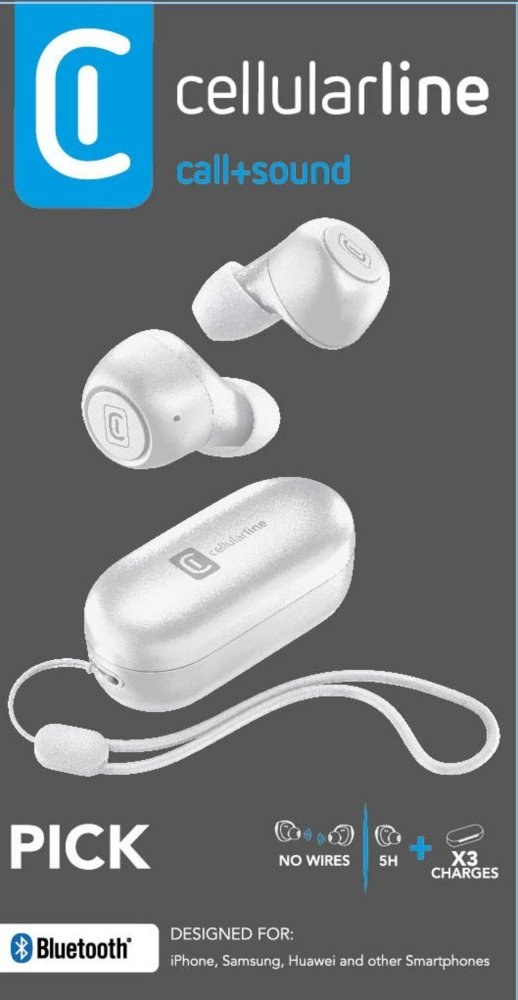 Kompaktní true wireless slúchadlá CellularLine Pick s praktickým dobíjacím púzdrom vám poskytnú úplnú slobodu pri počúvaní hudby. Po vybratí z puzdra, okamžite sa pripojí k spárovanému telefónu pomocou Bluetooth, pomocou technológie Double Master dokonca môžete používať ľavé alebo pravé slúchadlo samostatne. Díky minimálnym rozmerom a hmotnosti ľahko zabudnete, že máte slúchadlá v uchu. O bezchybnú hudobnú reprodukciu sa postará technológia Streaming Top Sound, ktorá optimalizuje bezdrôtový prenos zvuku. Při prehrávanie hudby vydrží integrovaná batéria až 5 hodín. Praktickým doplnkom je dobíjacie púzdro, ktoré dokáže celkom 3x úplne nabiť slúchadlá a poskytne dostatok energie na cestách. Celkovo tak slúchadlá poskytnú dostatok energie až na 20 hodín počúvania. Samotný dobíjací box sa pohodlne vojde do vrecka a môžete ho tak mať pekne po ruke. S vstavaným mikrofónom poslúži CellularLine Pick aj pre vybavenie telefónneho hovoru.Vlastnosti