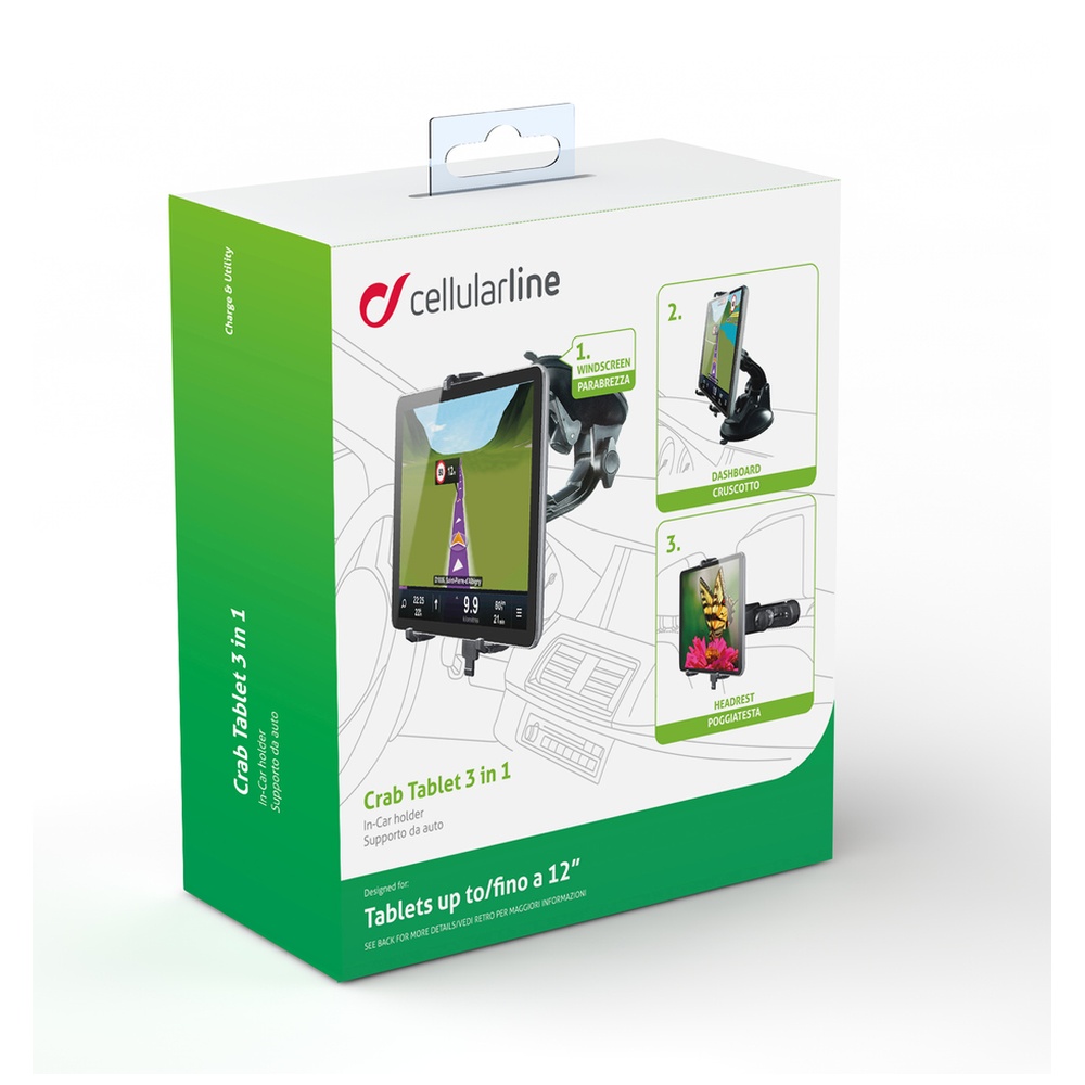 Otvorené balenieCRAB TABLET 3v1 predstavuje 3 držiaky v jednom produkte-3 rôzne systémy uchytenia. Môžete upevniť tabliet na čelné sklo vo vozidle a použiť ho ako navigáciu alebo na opierku hlavy a zabaviť tak spolucestujúci. Taktiež poskytuje možnosť upevnenia na stôl alebo pracovnú plochu.