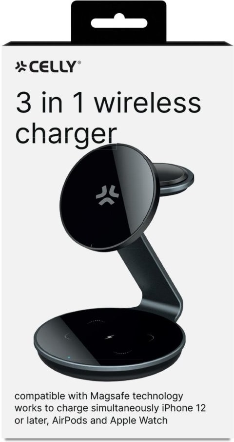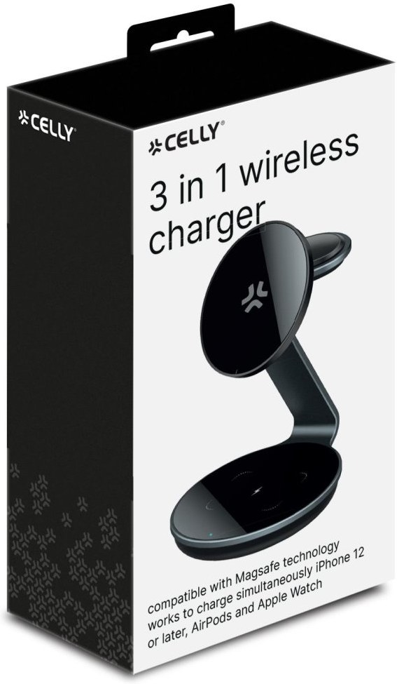 CELLY Bezdrôtová magnetická nabíjačka 3v1, 15 W, čierna