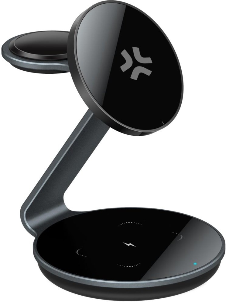 Stojan má pre každé zariadenie samostatné sloty: nabíjaciu základňu pre AirPods, magnetický držiak pre smartfóny v strede a slot pre Apple Watch v hornej časti.