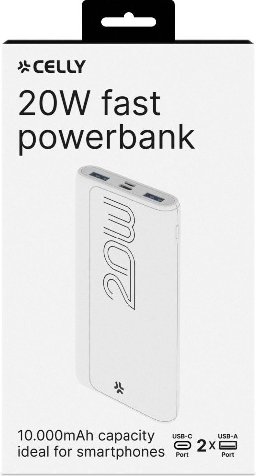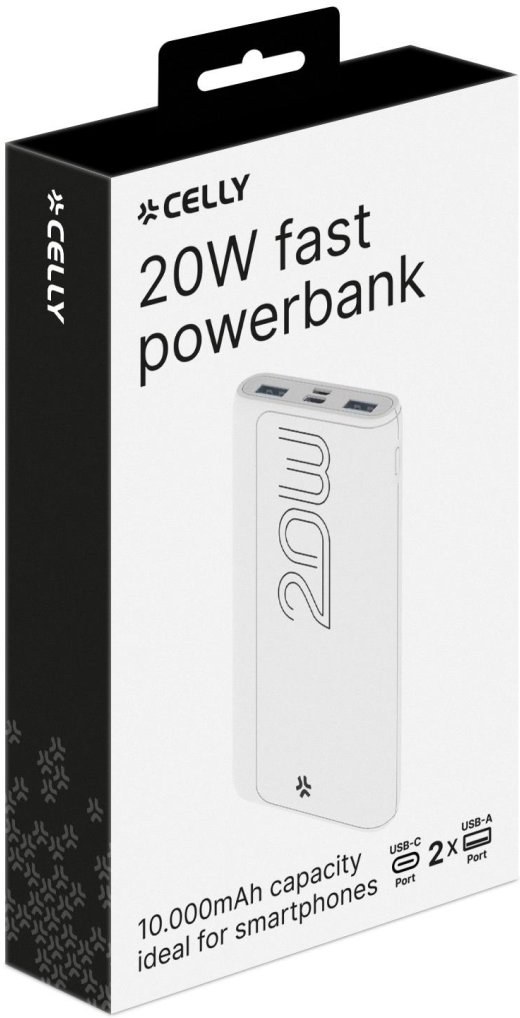 Powerbanka značky CELLY s kapacitou 10000 mAh, vybavená technológiou Power Delivery. Disponuje dvomi portami USB-A, jedným portom Micro USB a jedným portom USB-C. Vďaka tomu umožňuje súčasné nabíjanie až troch zariadení s maximálnym nabíjacím výkonom 20 W. Technológia Power Delivery zaručuje nabitie smartfónu alebo tabletu prostredníctvom portu USB-C za menej ako hodinu (v závislosti od kapacity batérie zariadenia).Vlastnosti: