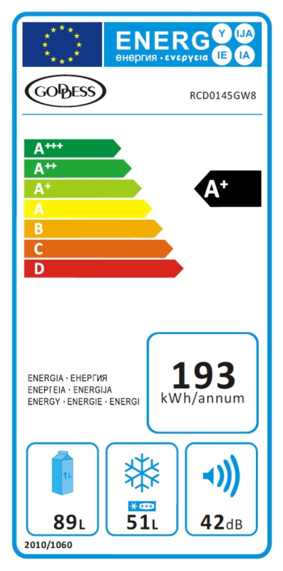 Kombinovaná chladnička Goddess RCD 0145 GW8 se řadí do úsporné energetické třídy A+ se spotřebou 193 kWh za rok.