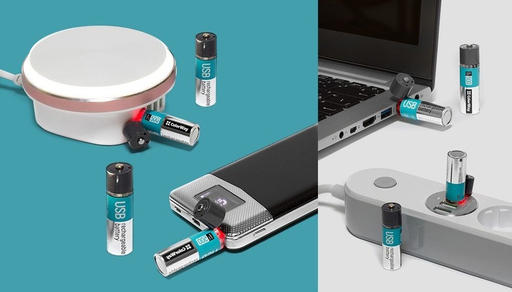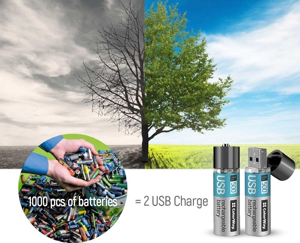 S nabíjateľnými batériami ColorWay USB už nebudete v situácii, keď sa vám obyčajné jednorázové batérie náhle vybijú a musíte ísť kúpiť nové do obchodu - pretože každá nabíjateľná batéria USB môže nahradiť až 500ks bežných batérií.Jednoduché nabíjanie