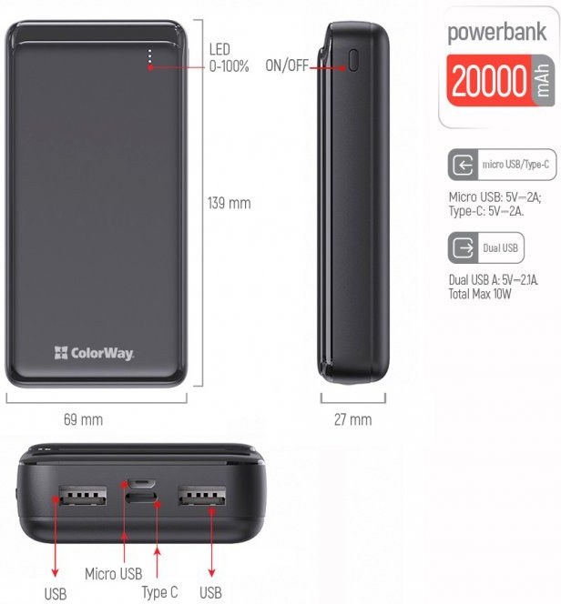 PowerBank ColorWay je vybavená kvalitnou 20000mAh lítium-polymérovou batériou, ktorá má niekoľko úrovní ochrany proti skratu a prepätiu, čo zaručuje bezpečnosť a eliminuje možnosť poškodenia pripojeného mobilného zariadenia.Kvalitné materiály