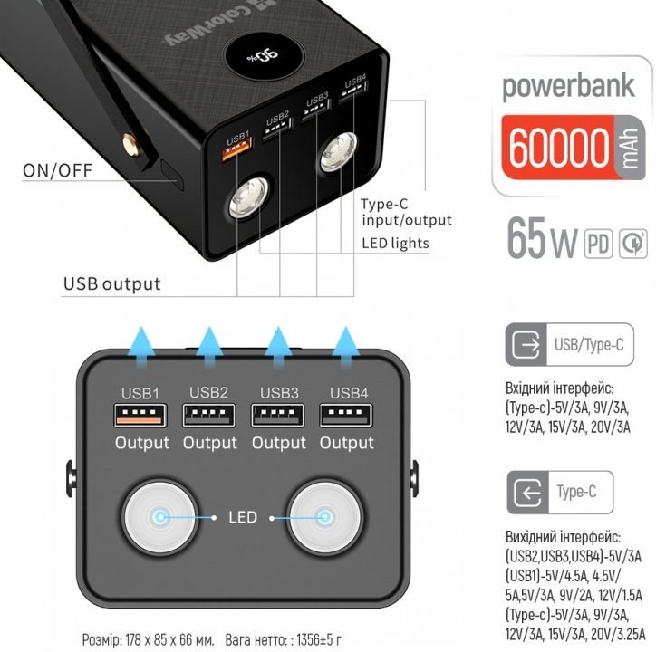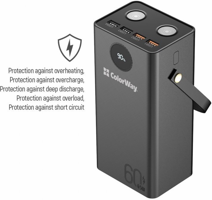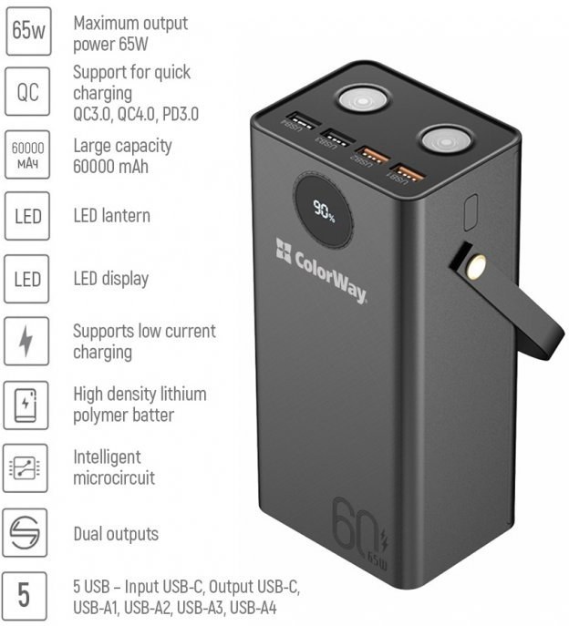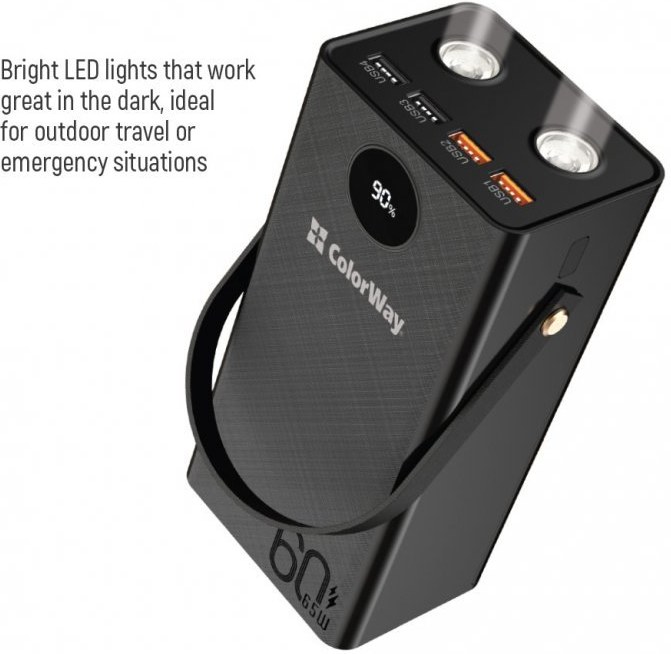 ColorWay powerbanka, 60 000 mAh Powerful, USB QC3.0 + USB-C Power Delivery 65W, čierna